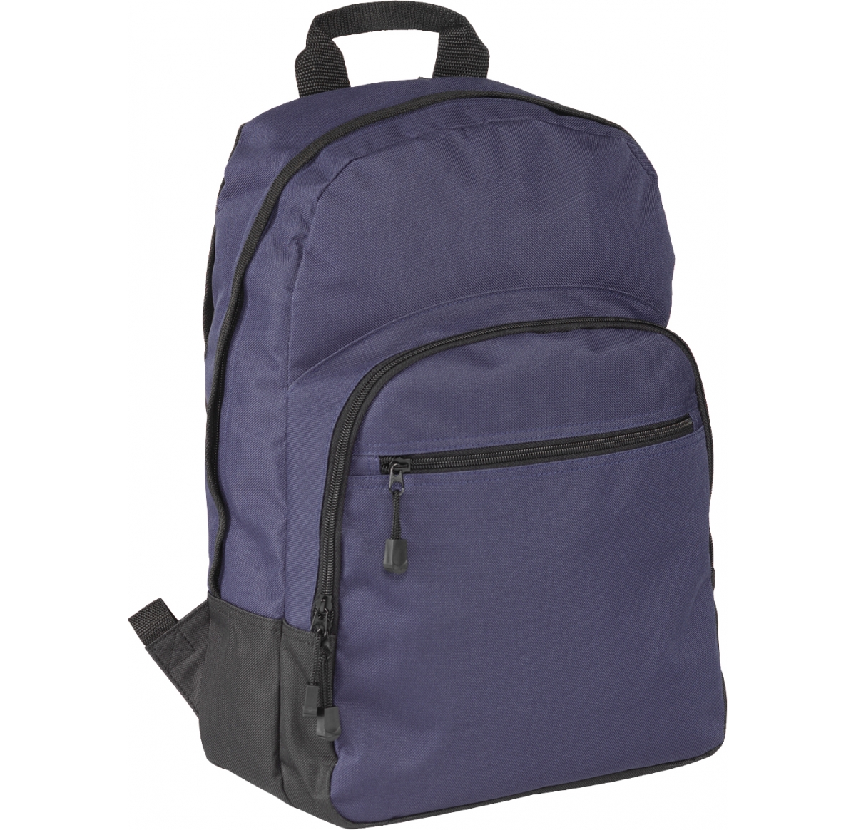 Durable promotional backpack made from REACH compliant* 300x250d polyester. C/w zipped front pocket & two zipped compartments.