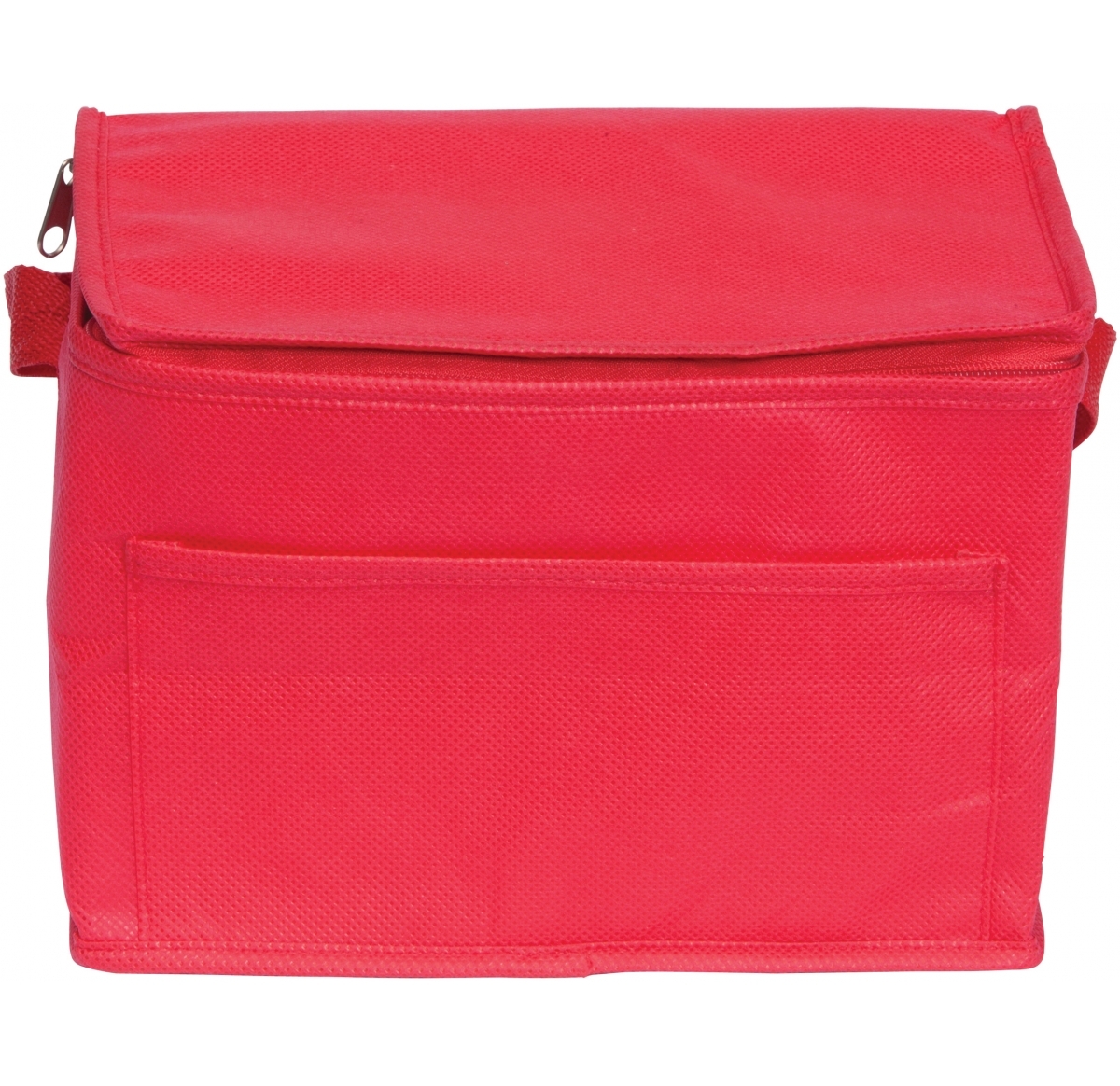 Budget 6 can cooler bag made from partly recycled REACH compliant* 80 gsm Non Woven Polypropylene c/w a front slip pocket & carry strap. Food Safe