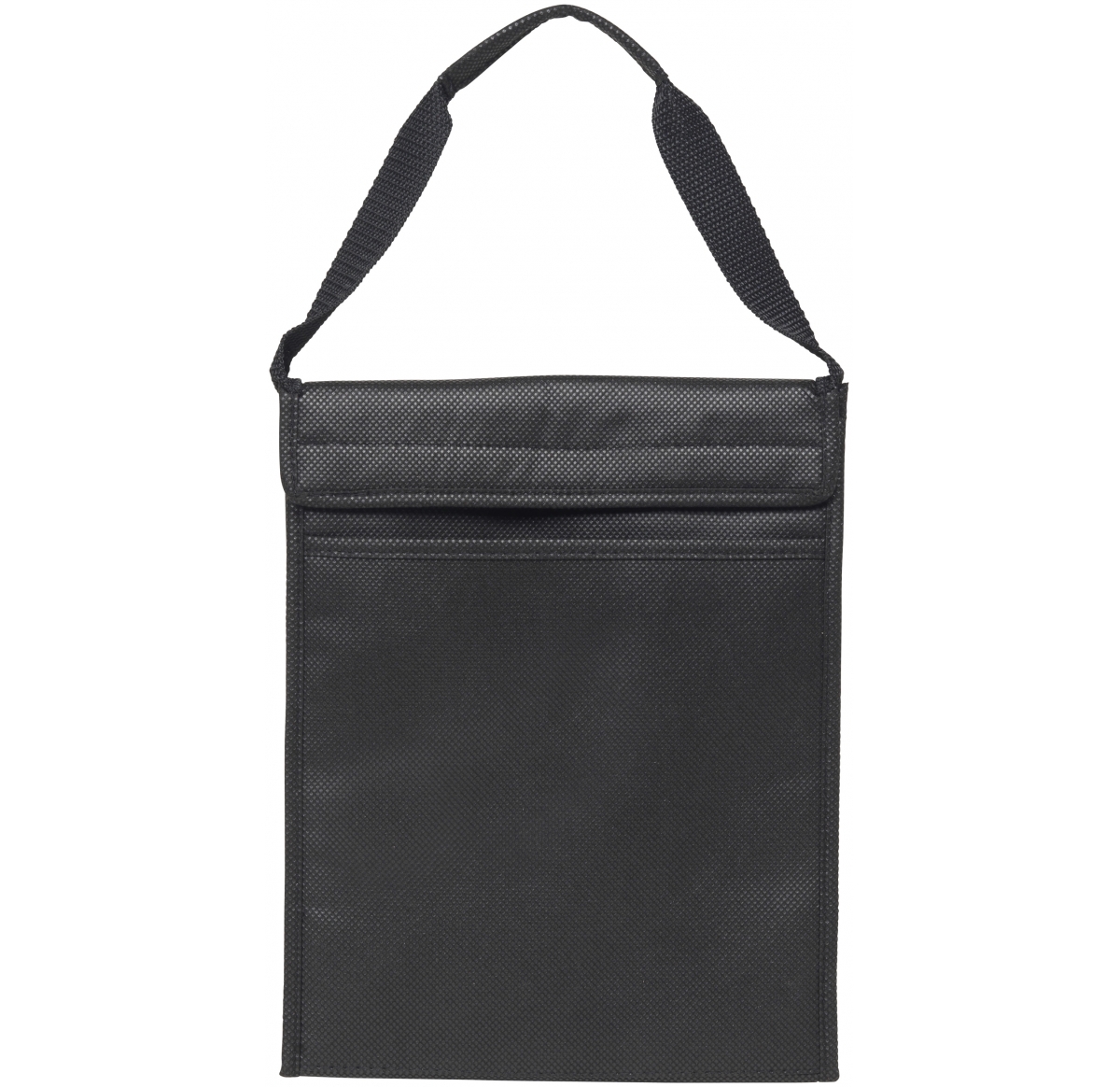 Budget lunch cooler bag made from partly recycled REACH compliant* 80 gsm Non Woven Polypropylene c/w a front slip pocket & carry strap. Food Safe