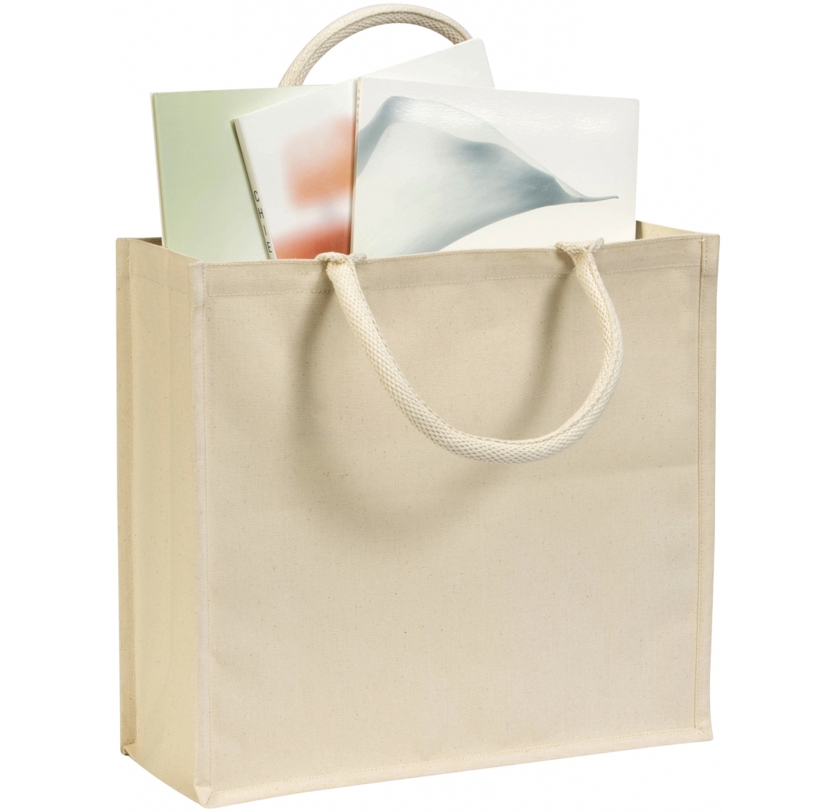 Durable 7oz (225gsm) Cotton Canvas bag c/w rope handles. With LDPE laminated backing for added structure.