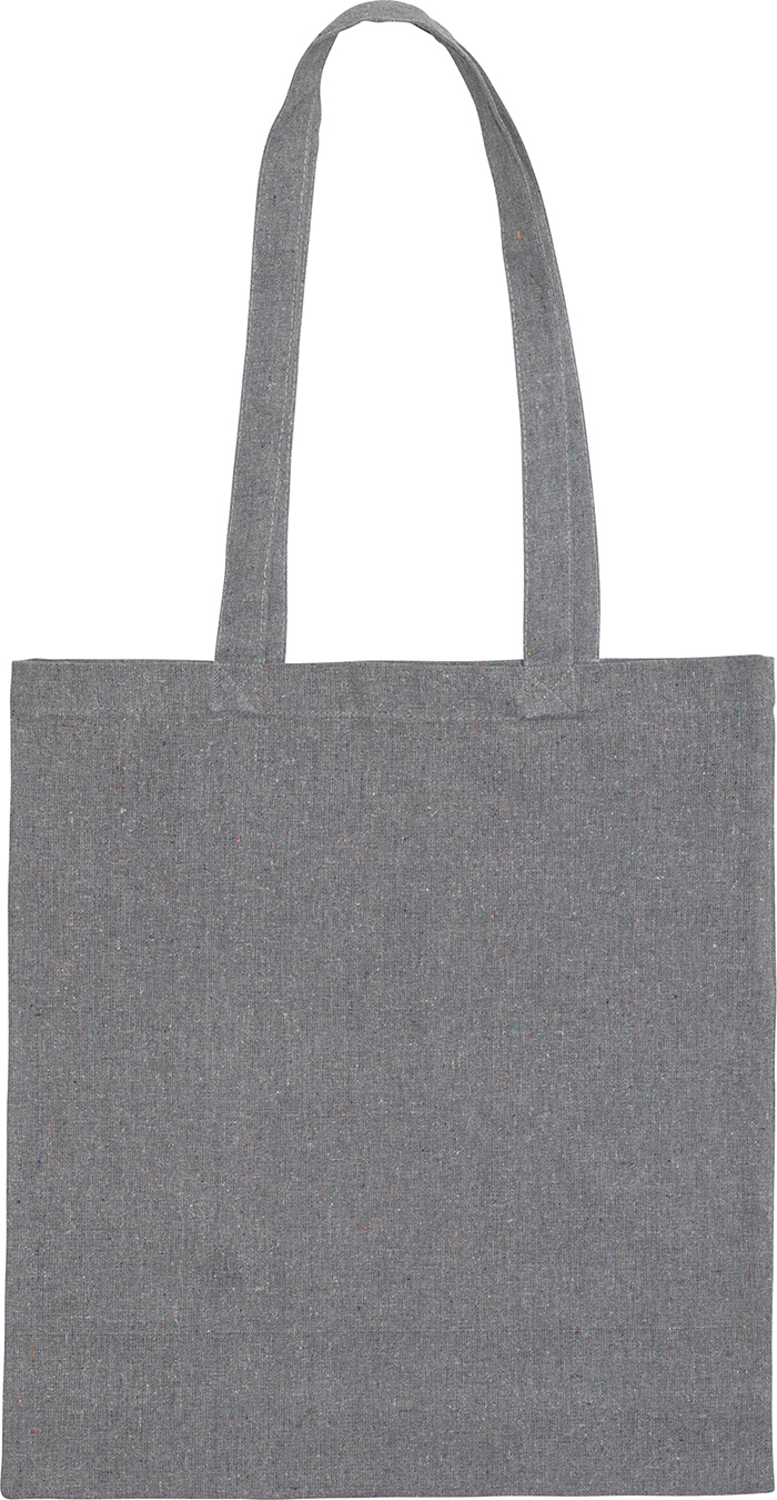 Recycled Cotton Tote Shopper 6.5oz (180gsm) with long handles. The fabric used to manufacture this bag is 75% recycled cotton from off cuts and waste cotton blended with 25% polyester (PET which is recycled fabric from plastic bottles) for extra structur??