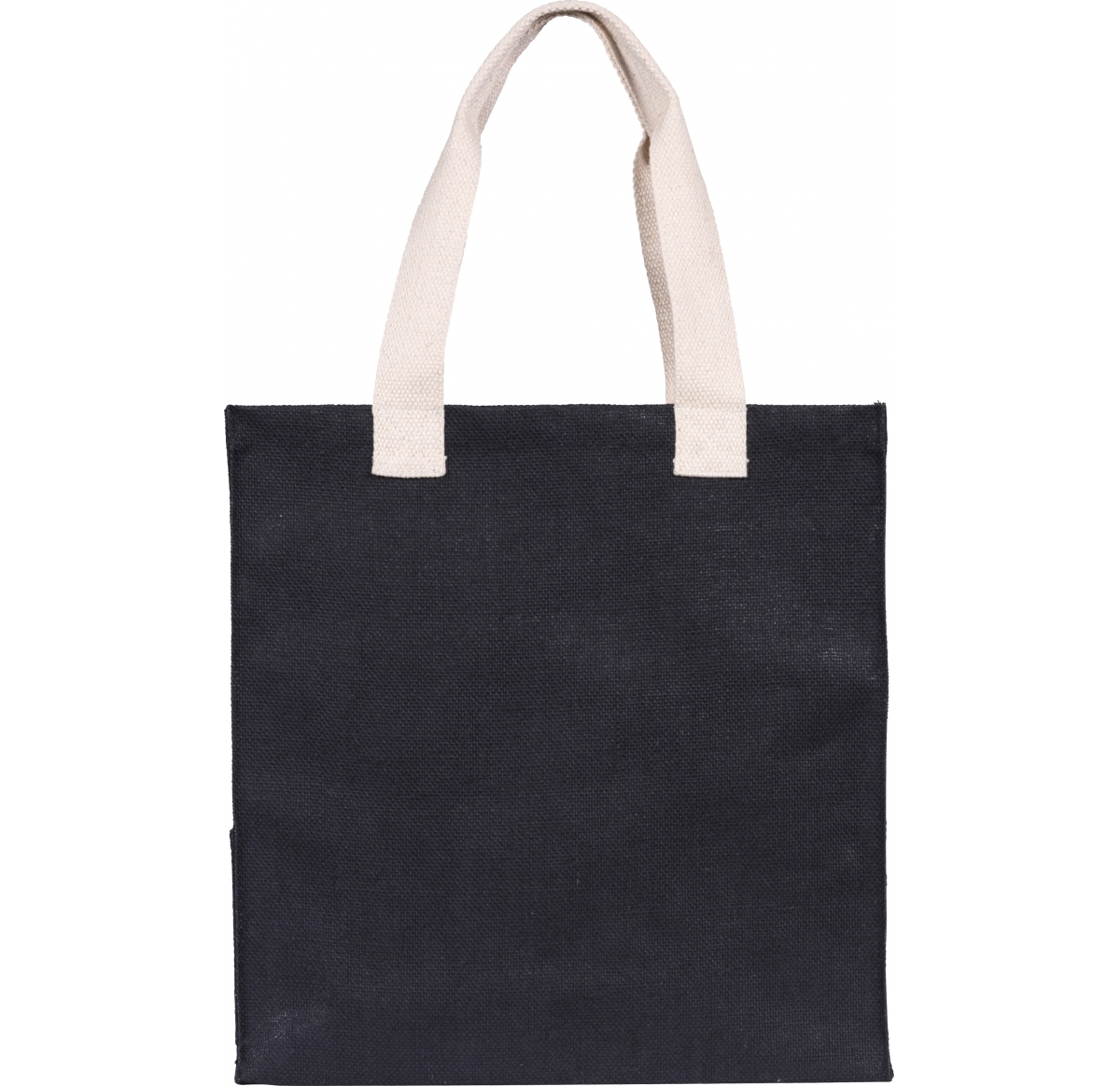 Large, environmentally friendly, Eco tote bag made from 14x15 natural jute c/w L.D.P.E laminate backing for added structure. C/w side pocket and cotton webbing handles..