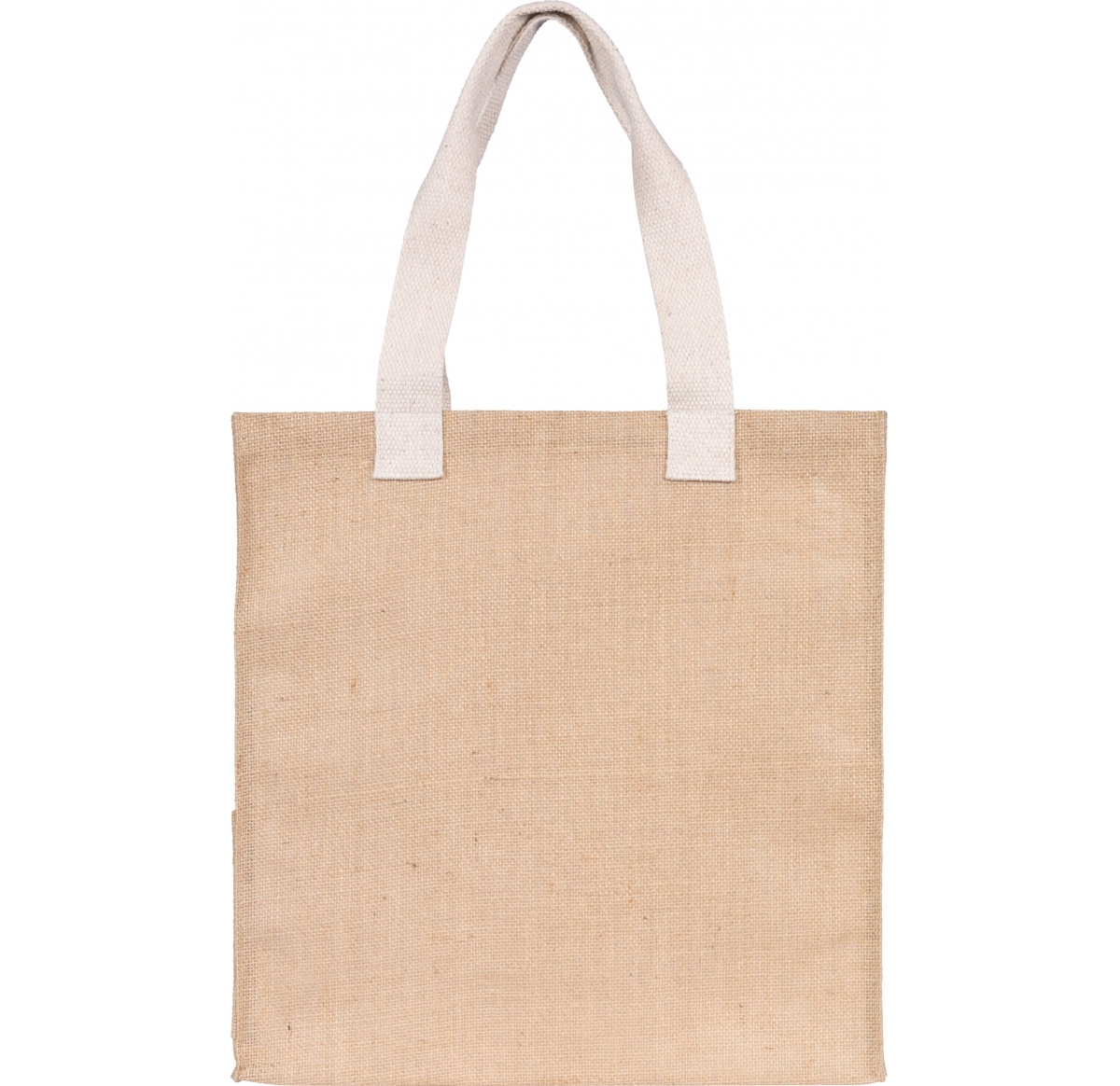Large, environmentally friendly, Eco tote bag made from 14x15 natural jute c/w L.D.P.E laminate backing for added structure. C/w side pocket and cotton webbing handles..
