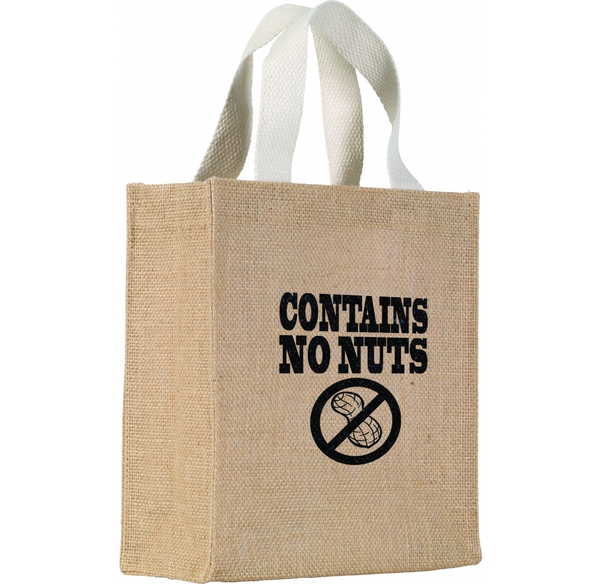 Small environmentally friendly Eco Gift bag made from 14x15 natural jute c/w L.D.P.E backing. Bag has cotton webbing handles (2.5cm x 30cm size).