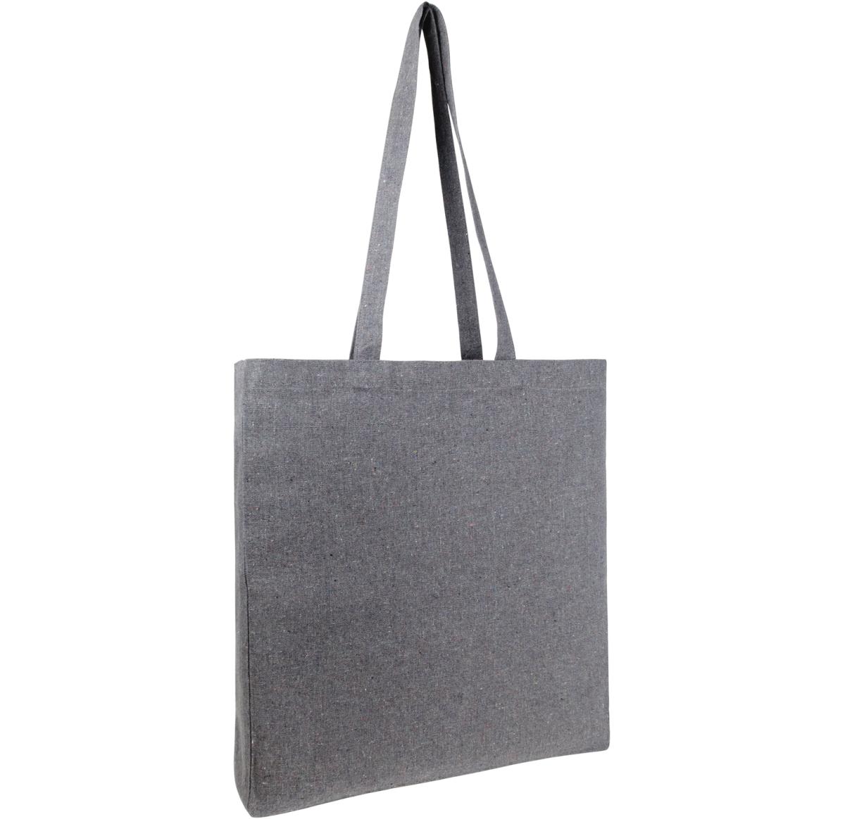 Eco Recycled 6.5oz Cotton Tote with long handles and 8cm gusset. The fabric used to manufacture this bag is 70% recycled cotton from off cuts and waste cotton blended with 30% polyester (rPET which is recycled fabric from plastic bottles) for extra structure. Due it's totally recycled nature, every bag and batch will differ