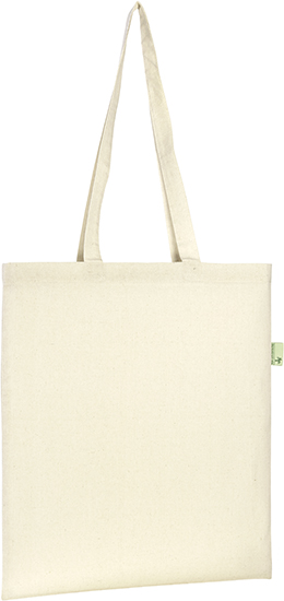 Environmentally Eco friendly 5oz (140gsm) recycled Cotton Shopper with long handles. Made from 70% recycled cotton blended with 30% recycled R-pet (from plastic bottles reclaimed from landfill)