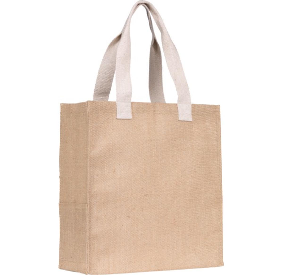 Large Eco tote shopper bag with PVA Starch backing, made from 14x15 natural jute with a side pocket and natural coloured cotton webbing handles.