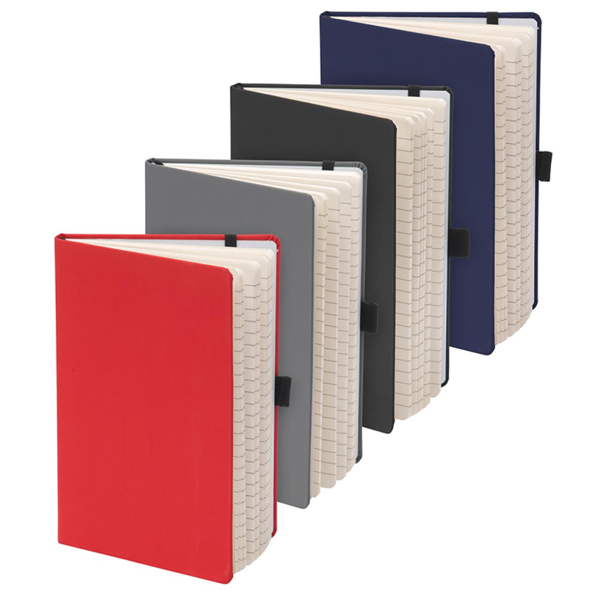 Soft feel PVC notebook with 96sheets 70g recycled cream paper with black rule line distance 8mm. Notebook has a cream paper tuck pocket inside back cover and elastic pen loop and cord for closure.