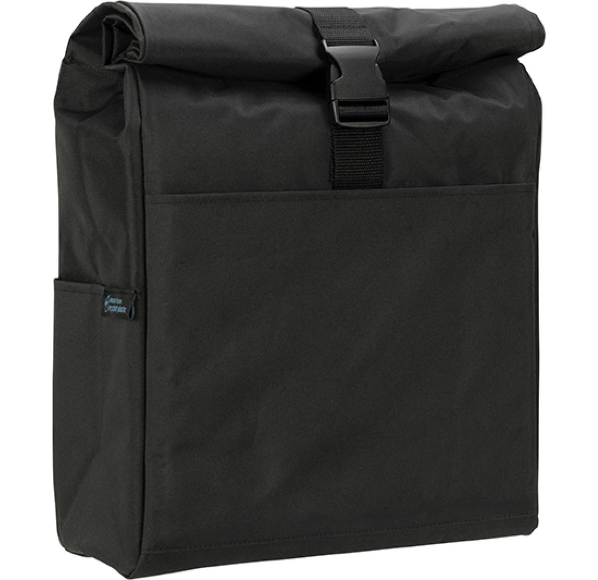 Quality R-Pet cooler backpack with adjustable shoulder straps, carry handle, front pocket, side pocket and internal PEVA lining. The bag has a 'ripper' top closing with extra press studs in the roll top style secured by a buckle.