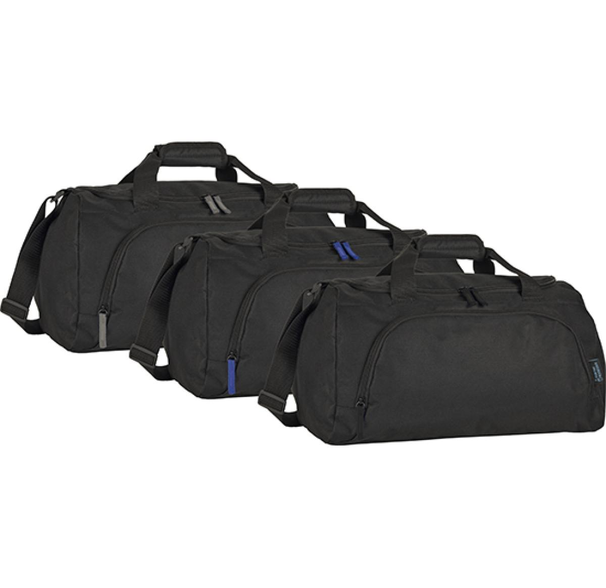 Durable recycled Duffle Sports bag made from 250x300d R-Pet (recycled bottles), zipped side and front pockets, base board, adjustable padded shoulder strap and wrap carry handles.