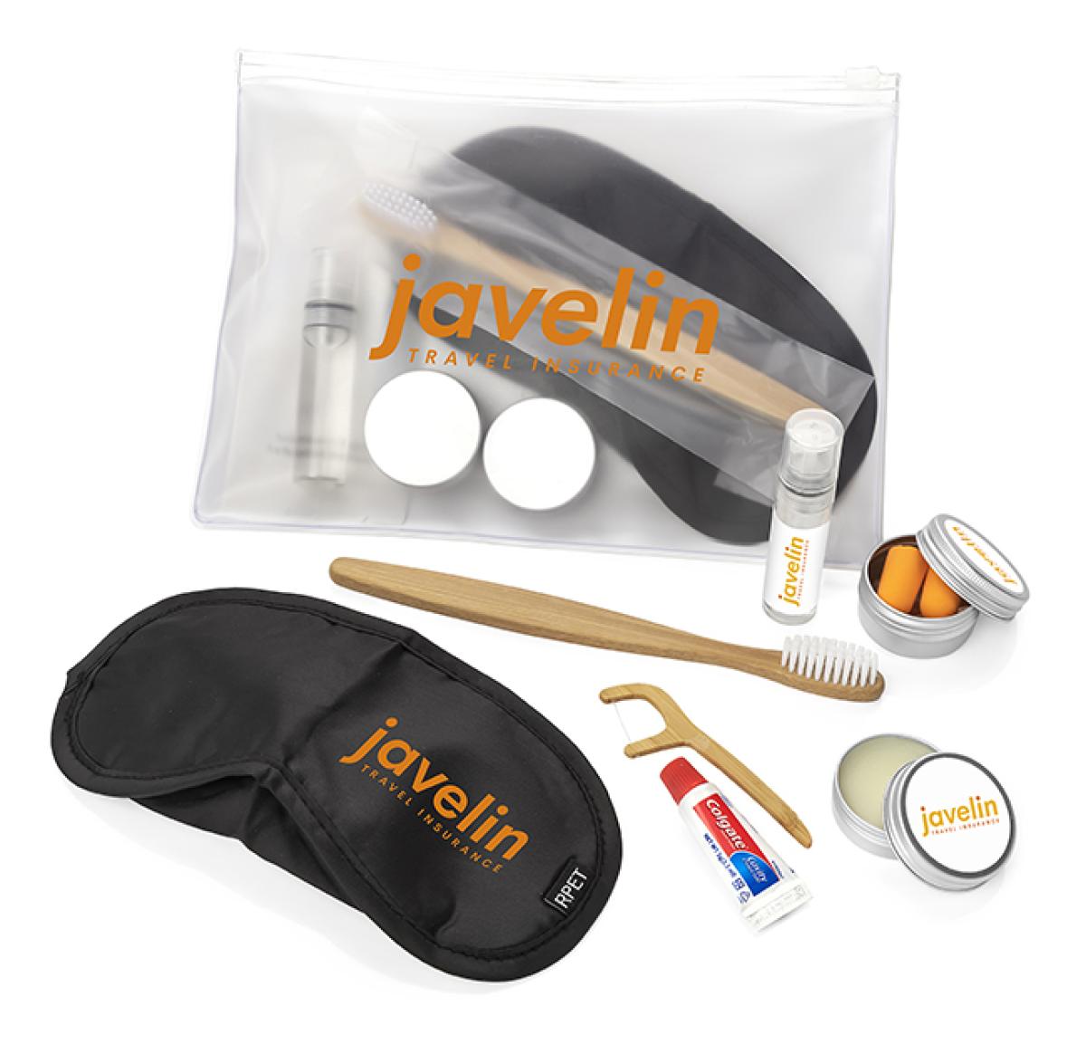 A frosted zippered wallet ideal for your travel essentials. Set includes; bamboo toothbrush, RPet sleep mask, 8ml pillow spray, ear plugs in a tin, lip balm in a tin, Colgate toothpaste and bamboo dental floss stick. PVC bag, pillow spray & lip Balm are made in the UK. Price includes a 1-colour print to the wallet, contents can be branded at an additional cost.