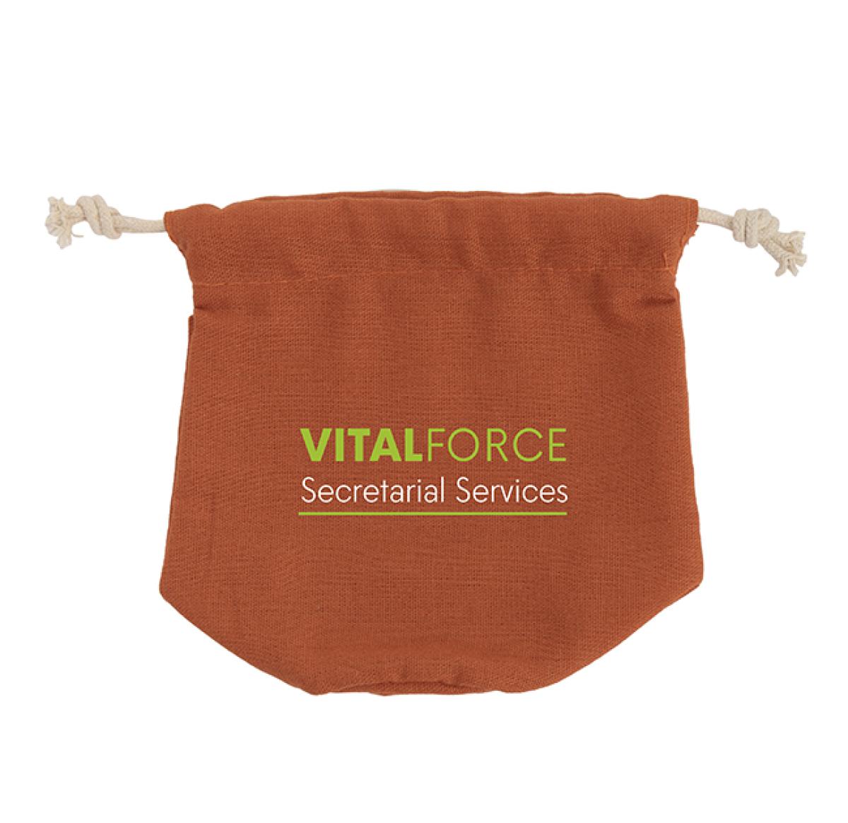 A small sized natural hemp drawstring bag in orange