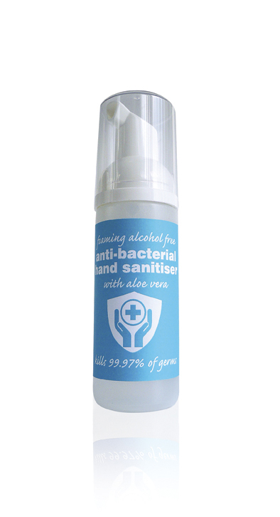 50ml foaming alcohol-free hand sanitiser. Tested and complies with BS EN1500.