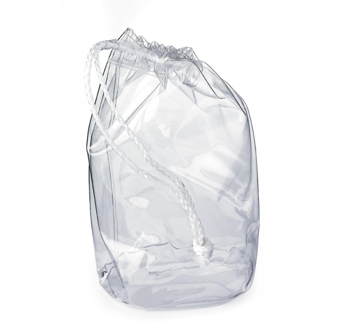 Clear PVC drawstring bag with white cord. Easy clean 0.02mm thick PVC