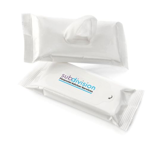 Pack of 15 antibacterial wet wipes in a soft resealable pack from stock. Pull back label can be branded with up to 4 colours. Available in other colours subject to minimum quantities and availability. Each wipe measures approximately 195mm x 120mm.