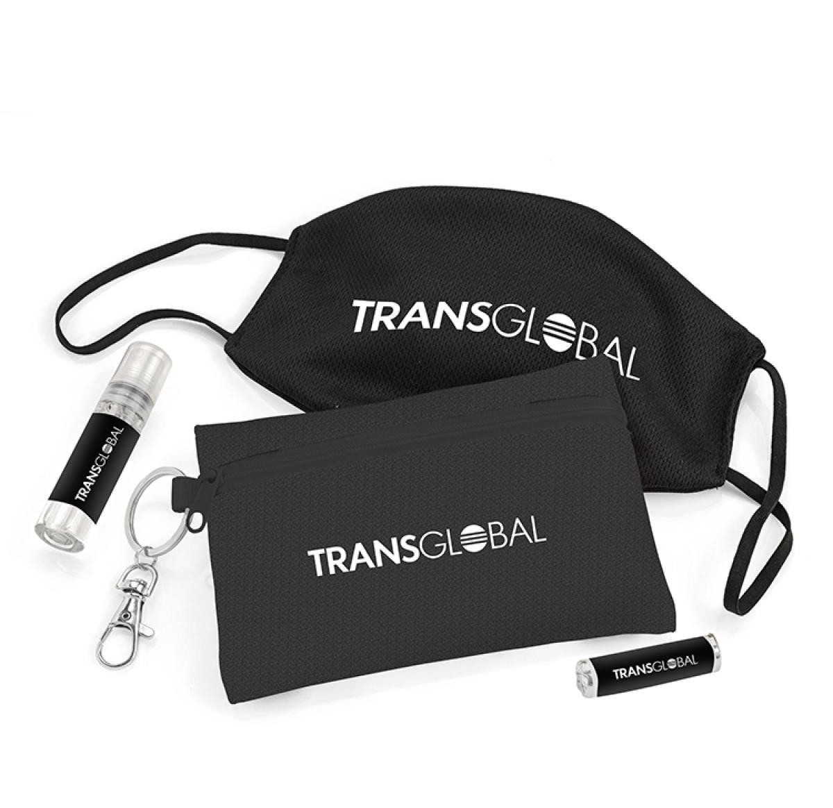 Whether you are working from home or back in the office this handy little set of essentials includes: 8ml hand sanitiser, roll of mints, printed face mask and a full colour printed zippered pouch on a clip made from post-consumer recycled plastic bottles (RPET). Machine washable. don'tPrices are based on branding to the bag only, contents can be branded at an additional cost.don't