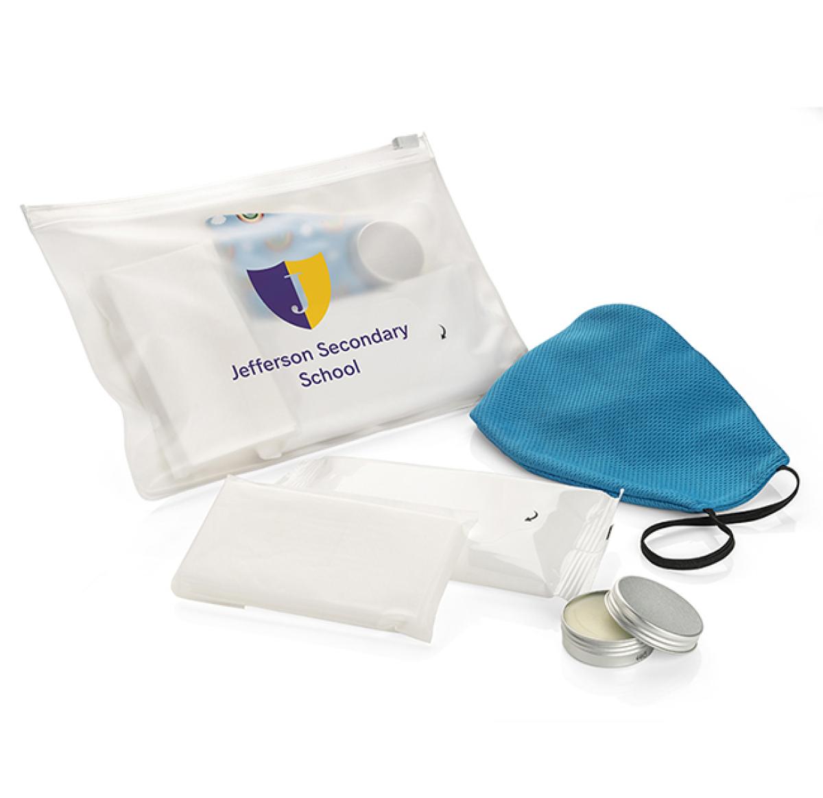 A practical zippered pouch which can be used as a pencil case made from easy wipe clean Polypropylene. This handy little set of essentials includes: A pack of 5 tissues in a biodegradable pack, 10ml lip balm, washable face mask and pack of 15 antibacterial wet wipes. don'tPrices are based on branding to the pouch only (1-colour), contents can be branded at an additional cost.don't
