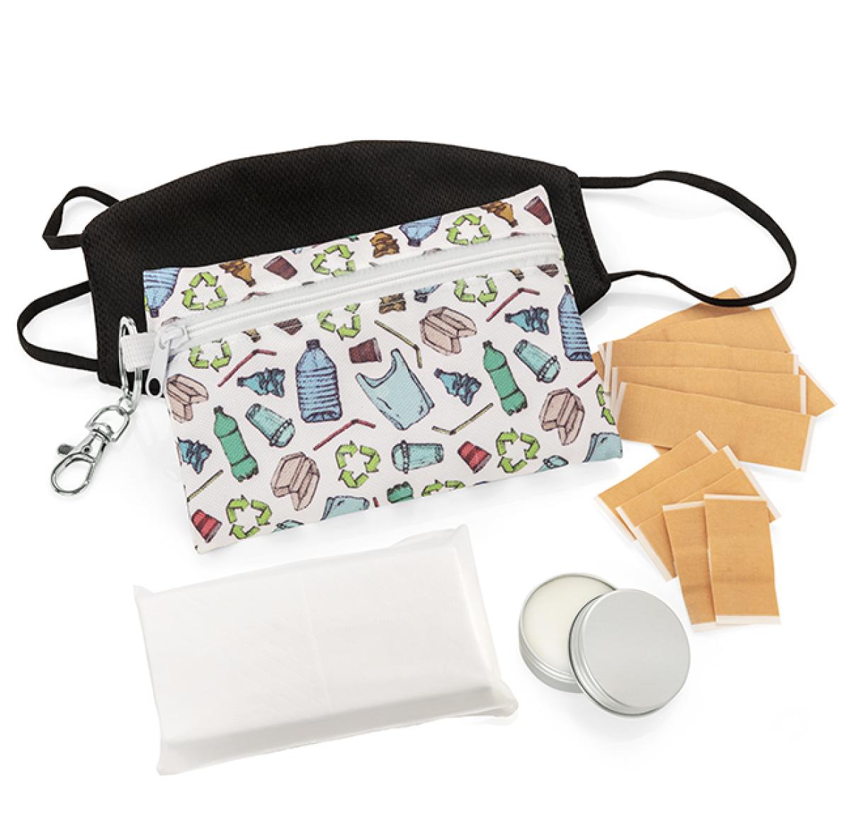 A handy selection of essentials including 10 assorted plasters, foot balm, face mask and tissues all in a full colour printed zippered pouch on a clip made from post-consumer recycled plastic bottles (RPET). Machine washable. don'tPrices are based on branding to the bag only, contents can be branded at an additional cost.don't