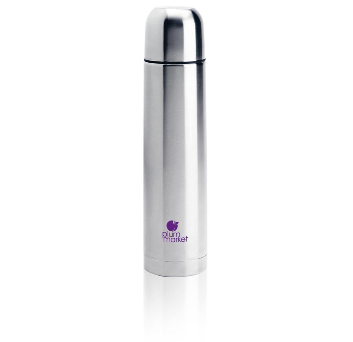 1L double wall and vacuum stainless steel flask with push closure and cup.