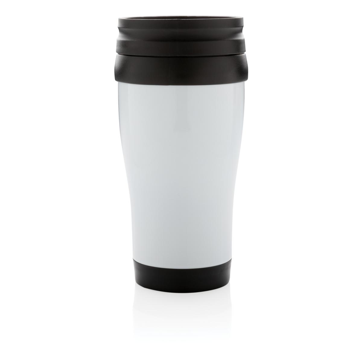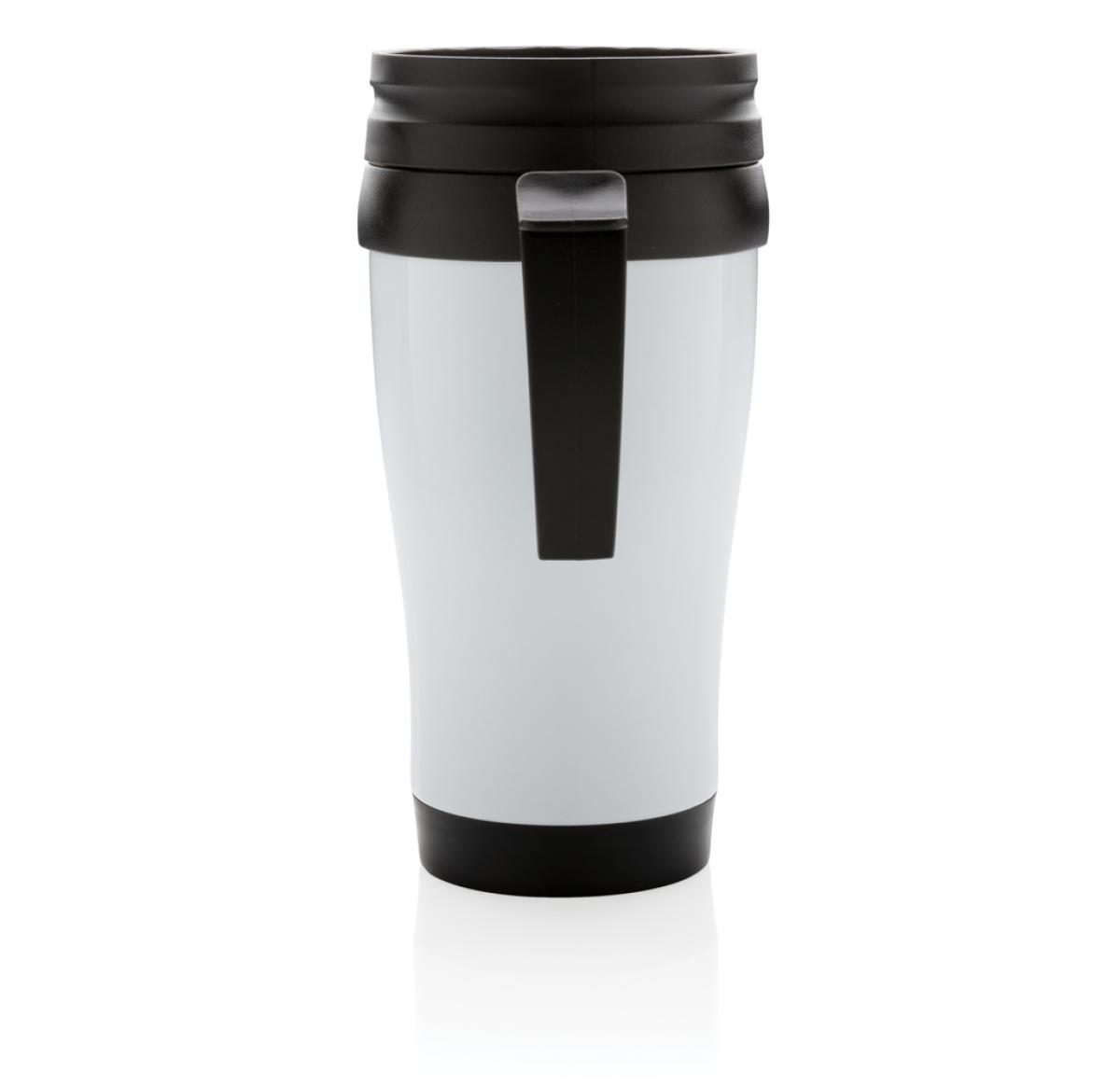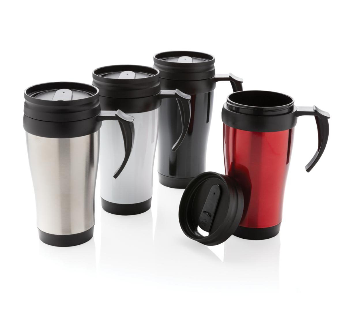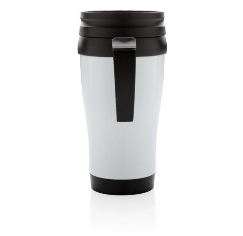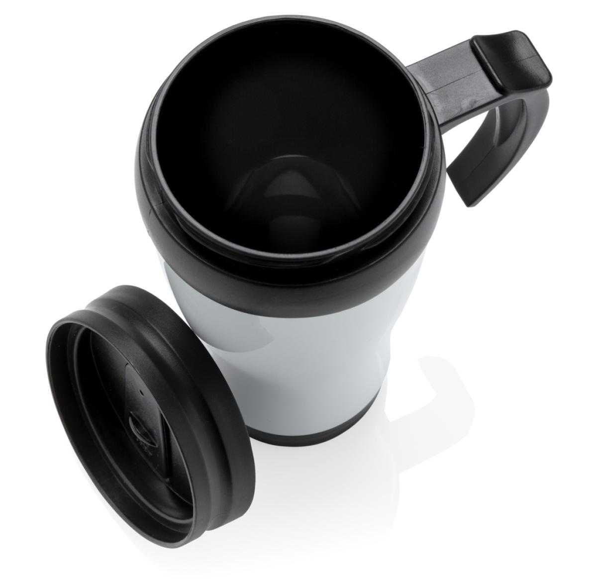 350ml stainless steel outside and PP inside mug with lid and base in black.