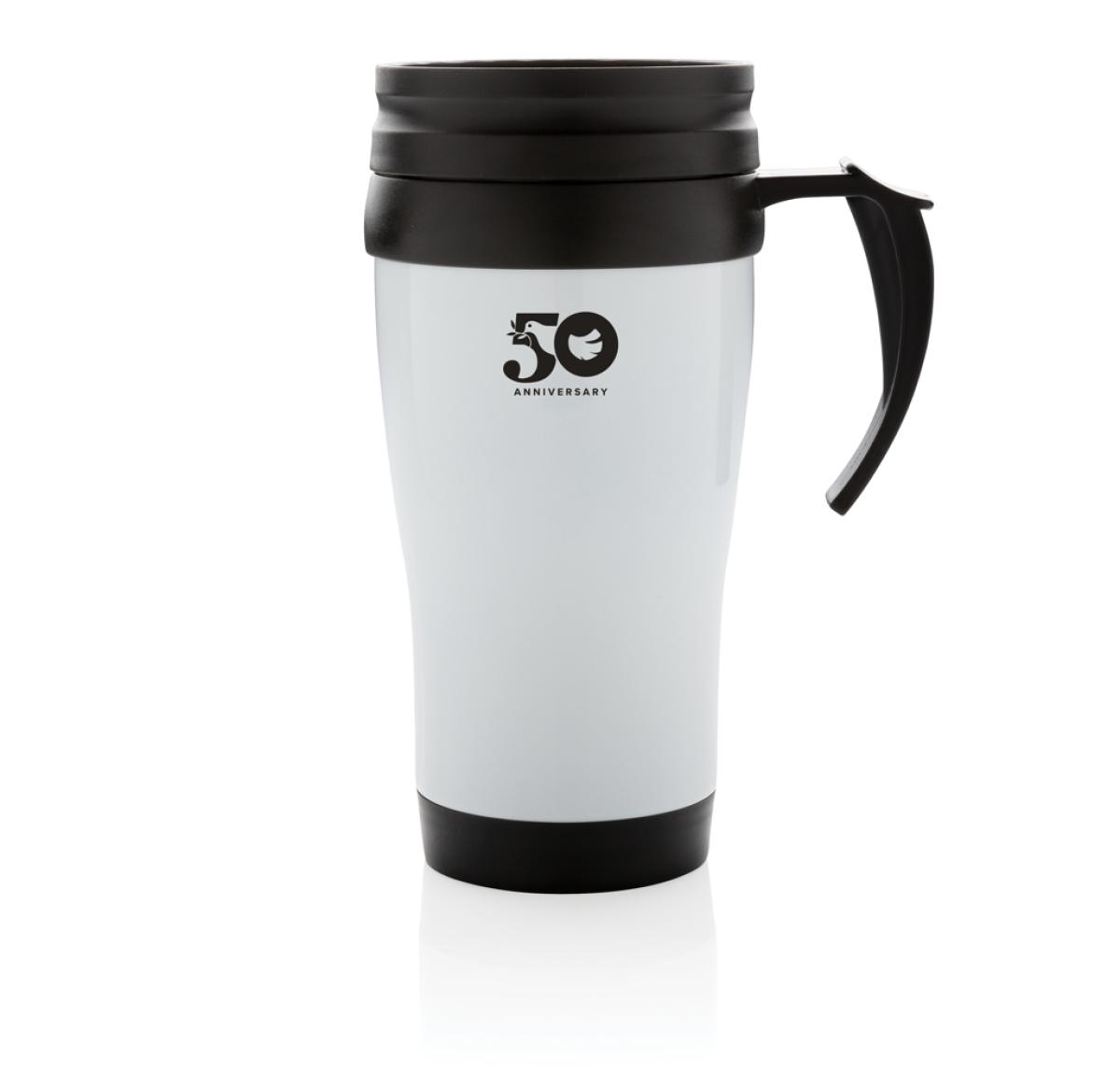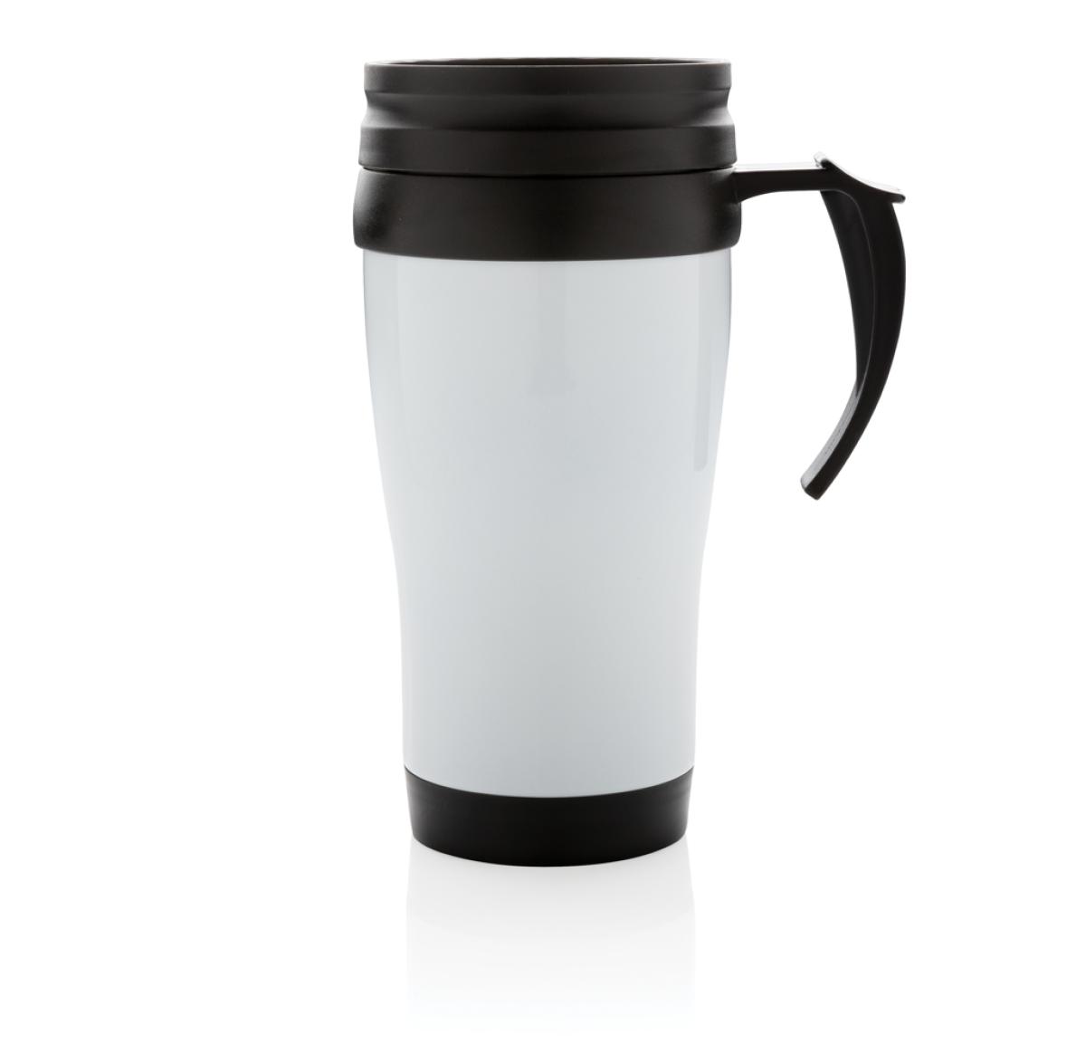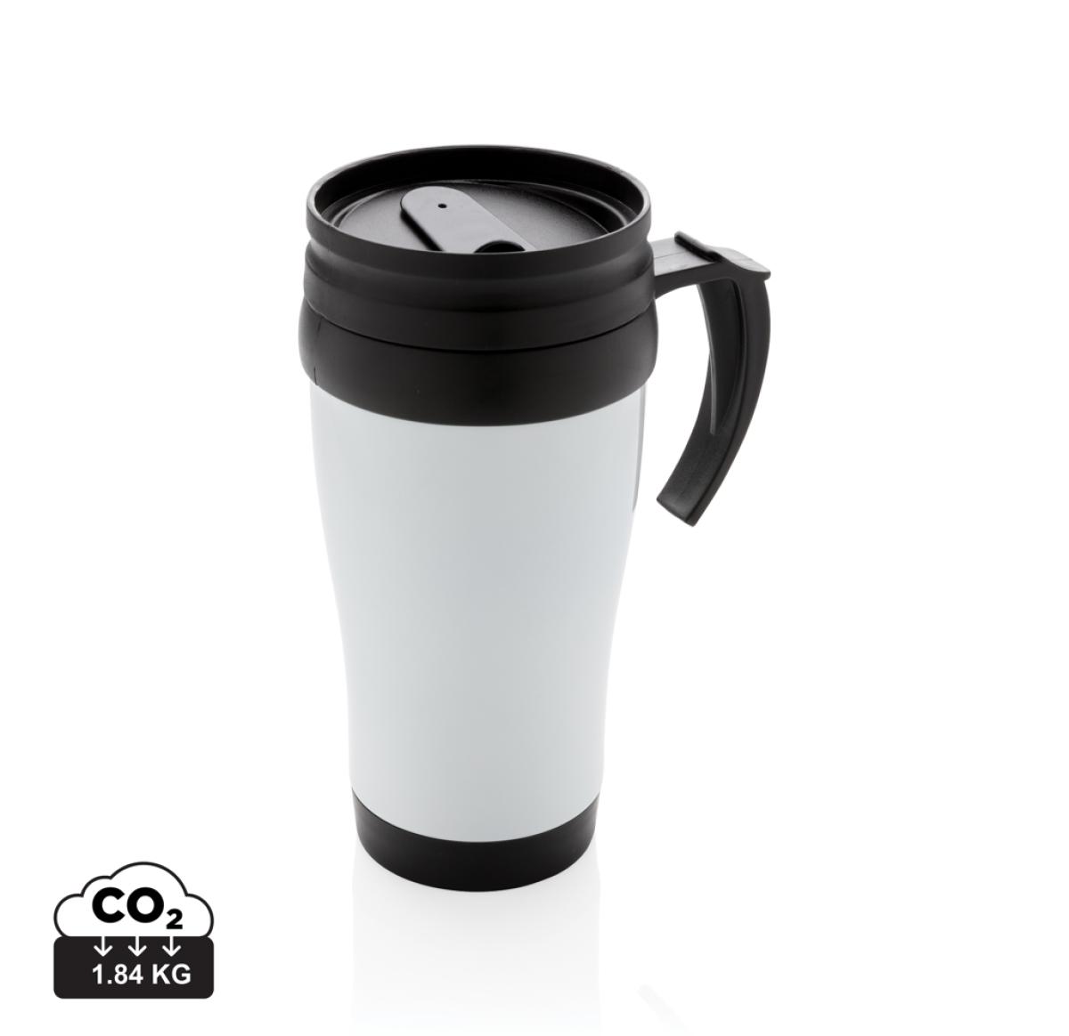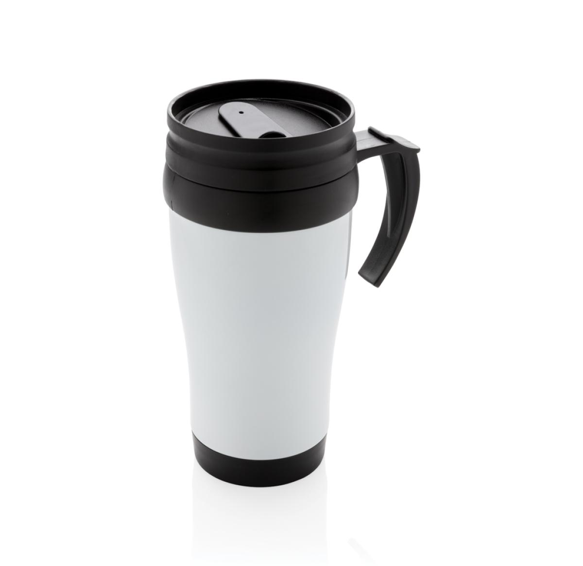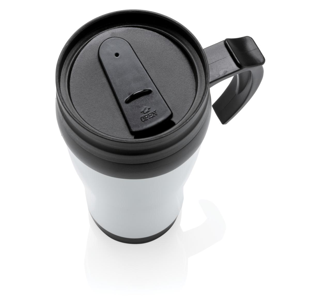 350ml stainless steel outside and PP inside mug with lid and base in black.