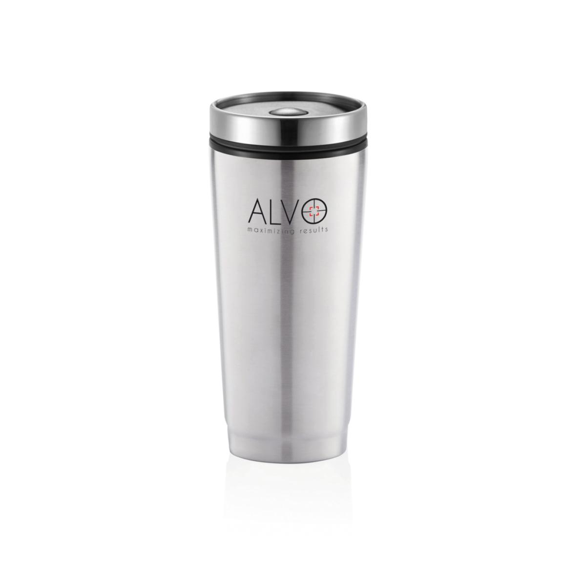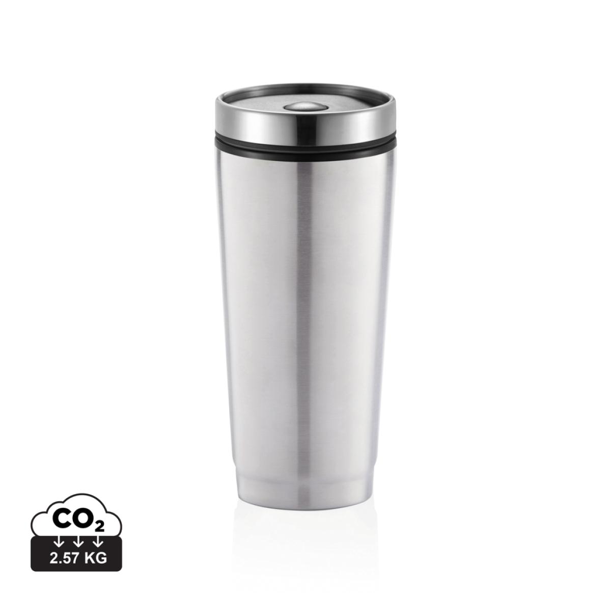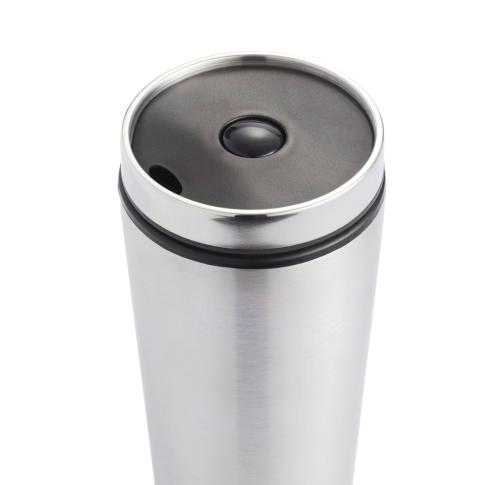 350ml stainless steel outside and PP inside tumbler with screw on lid and unique push button closure to prevent spilling. Suitable for single hand operation. Registered design®