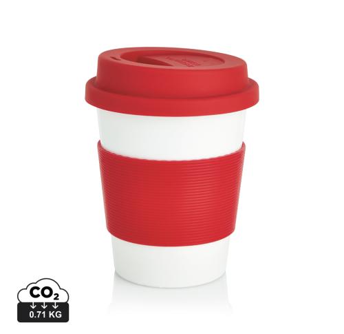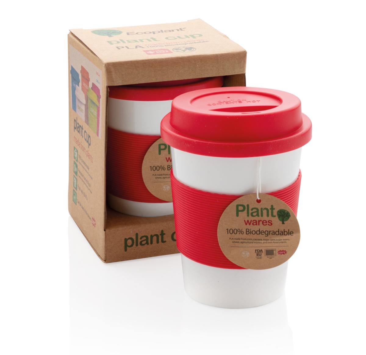 350ml tumbler with silicone grip and lid. Manufactured from 100% plant material (PLA). BPA free and dishwasher proof.