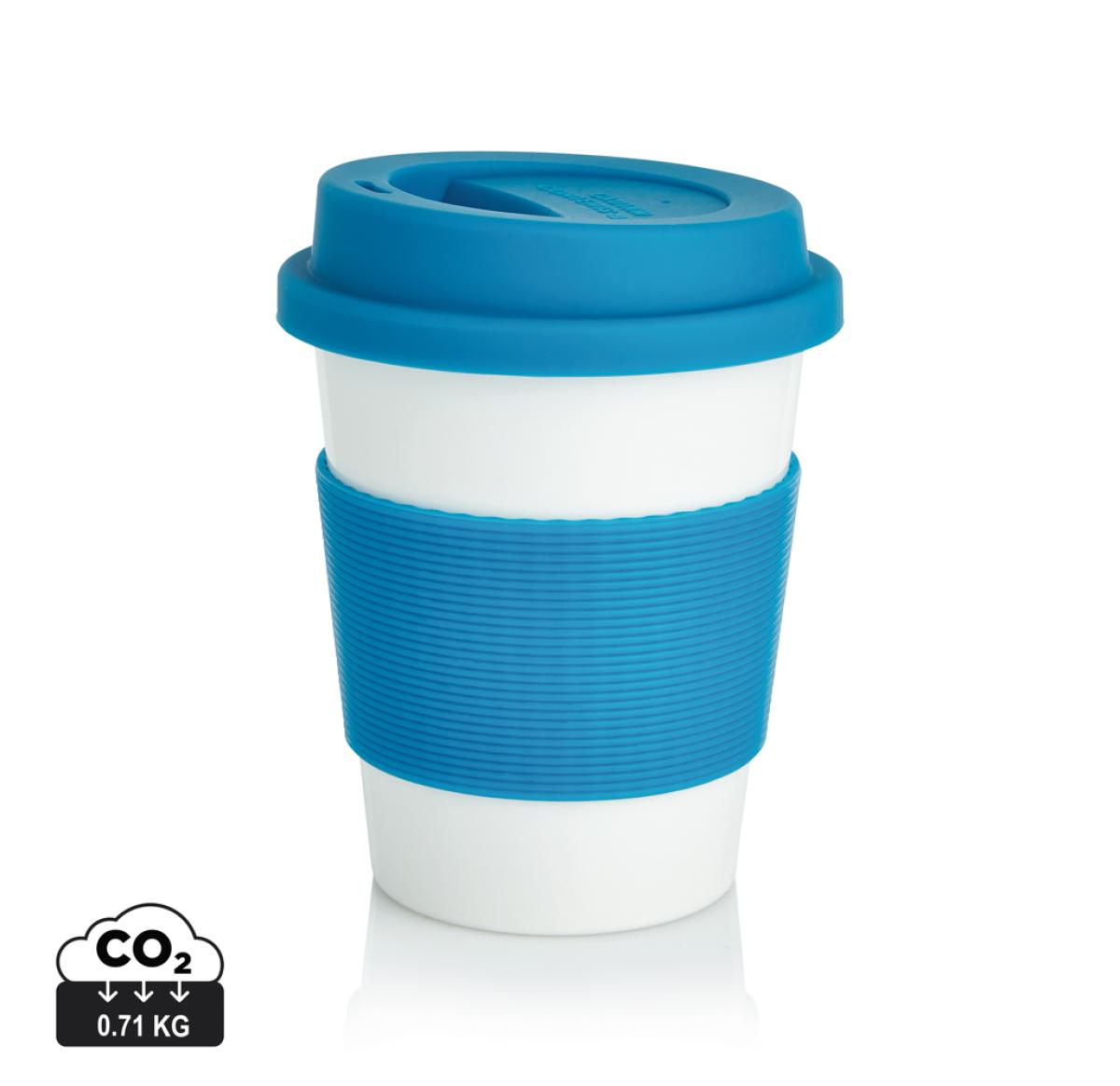 350ml tumbler with silicone grip and lid. Manufactured from 100% plant material (PLA). BPA free and dishwasher proof.