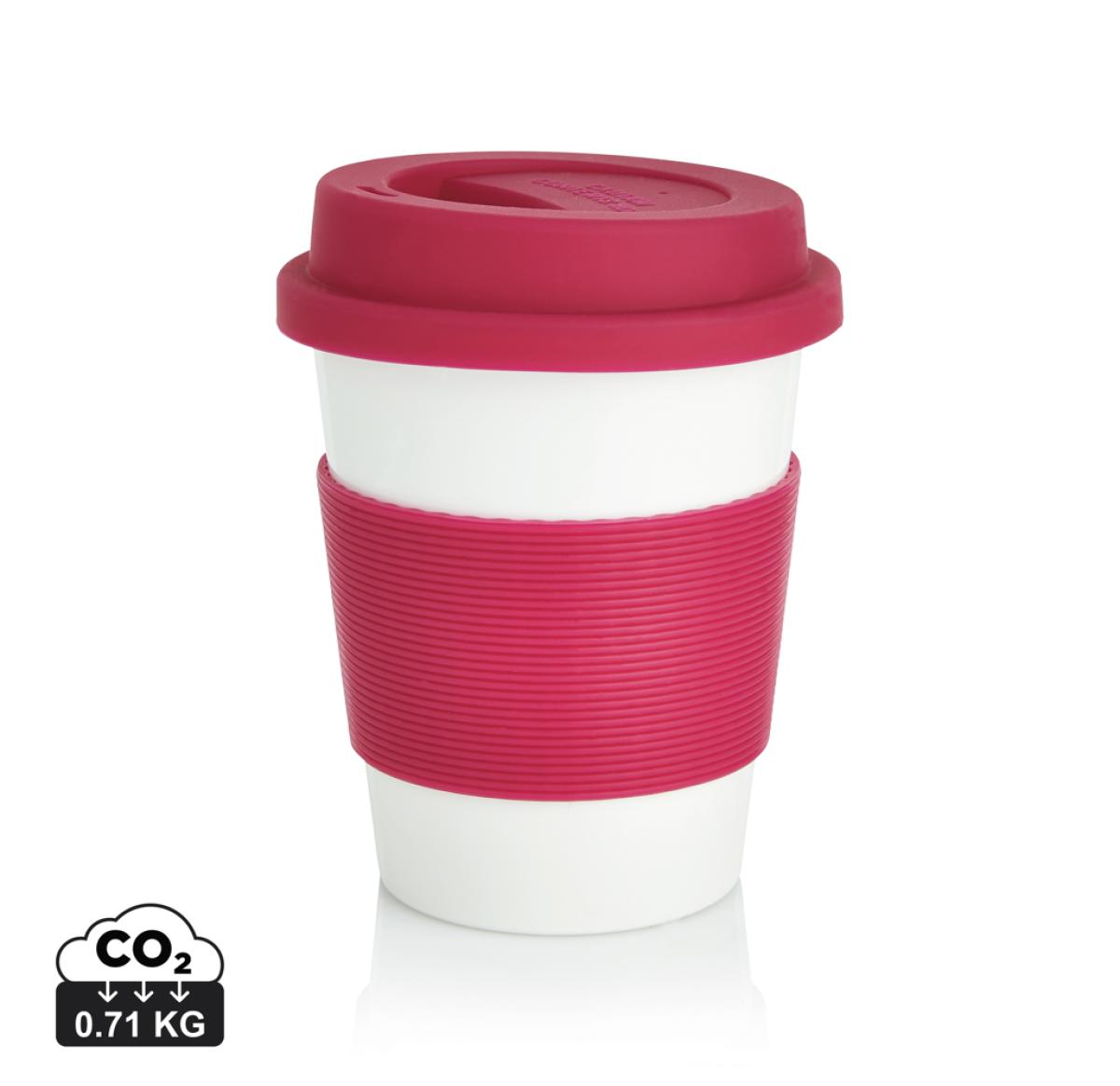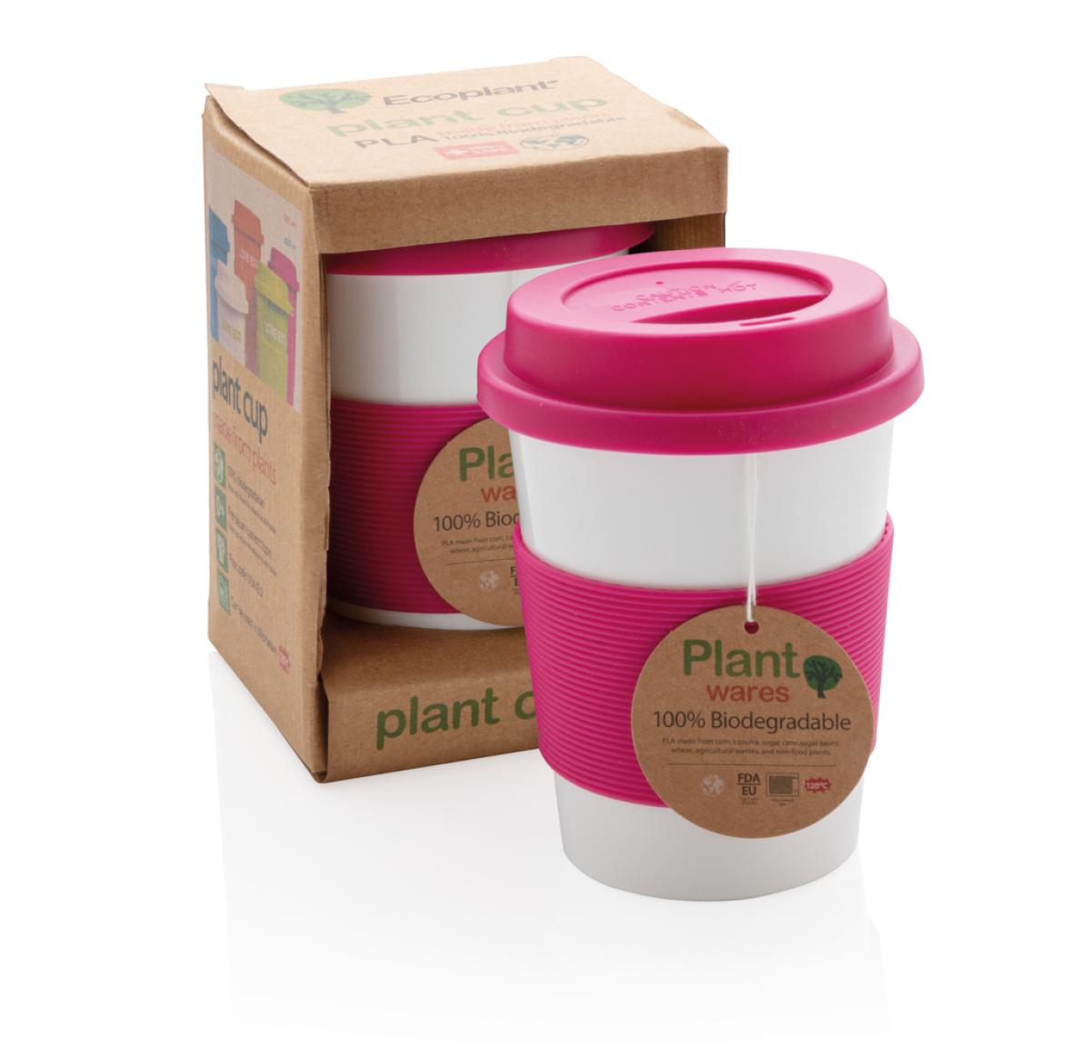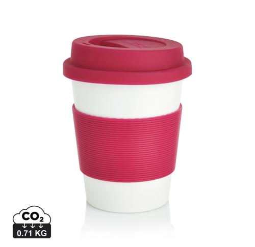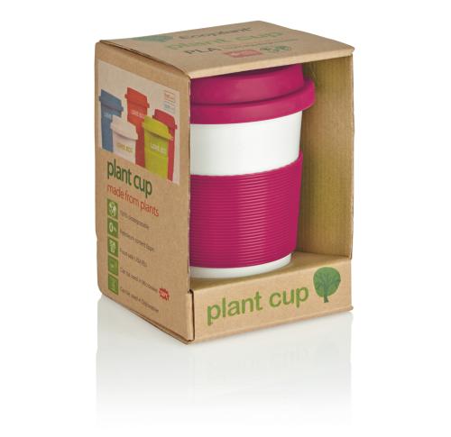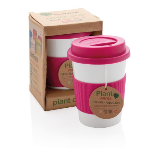350ml tumbler with silicone grip and lid. Manufactured from 100% plant material (PLA). BPA free and dishwasher proof.