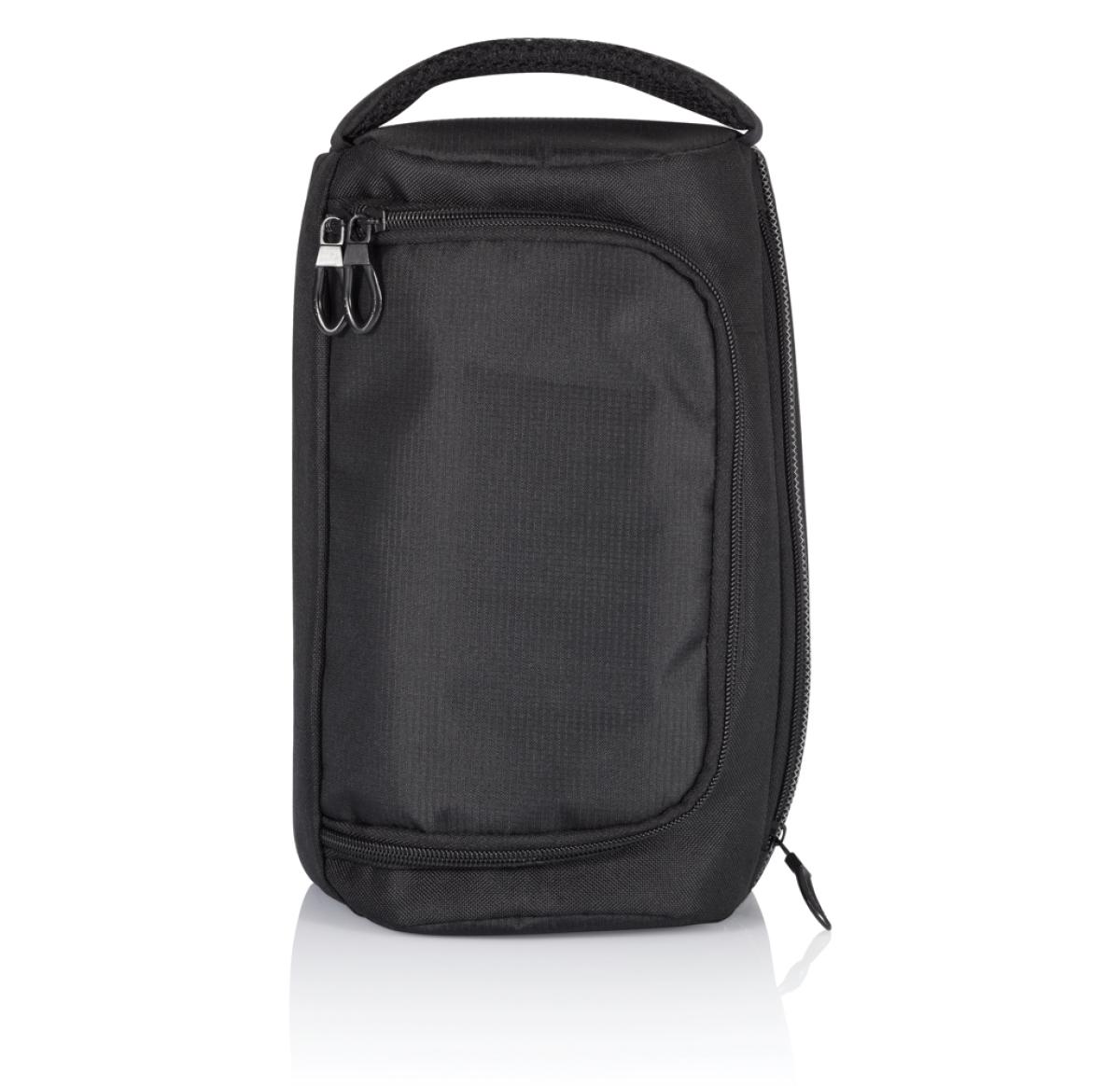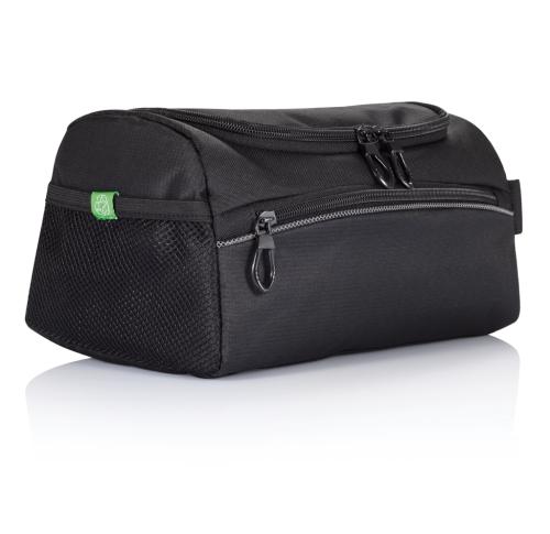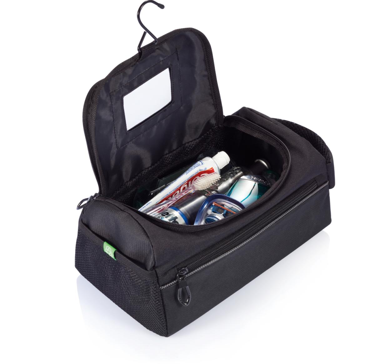 600D ripstop, main compartment, metal hook, mirror, mesh pocket inside, front pocket, mesh pocket at left side, PVC free.
