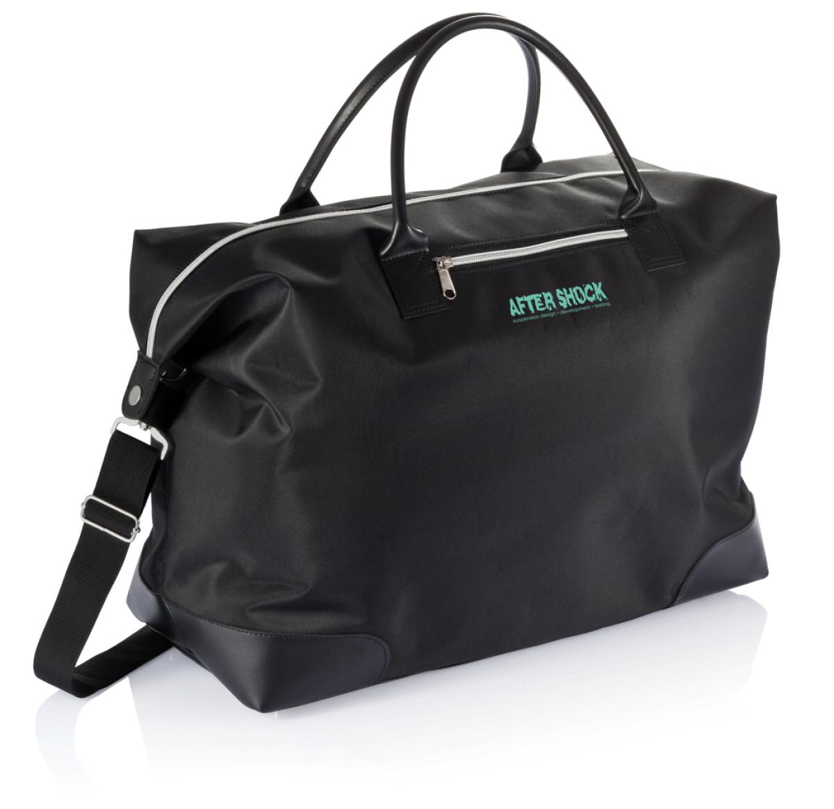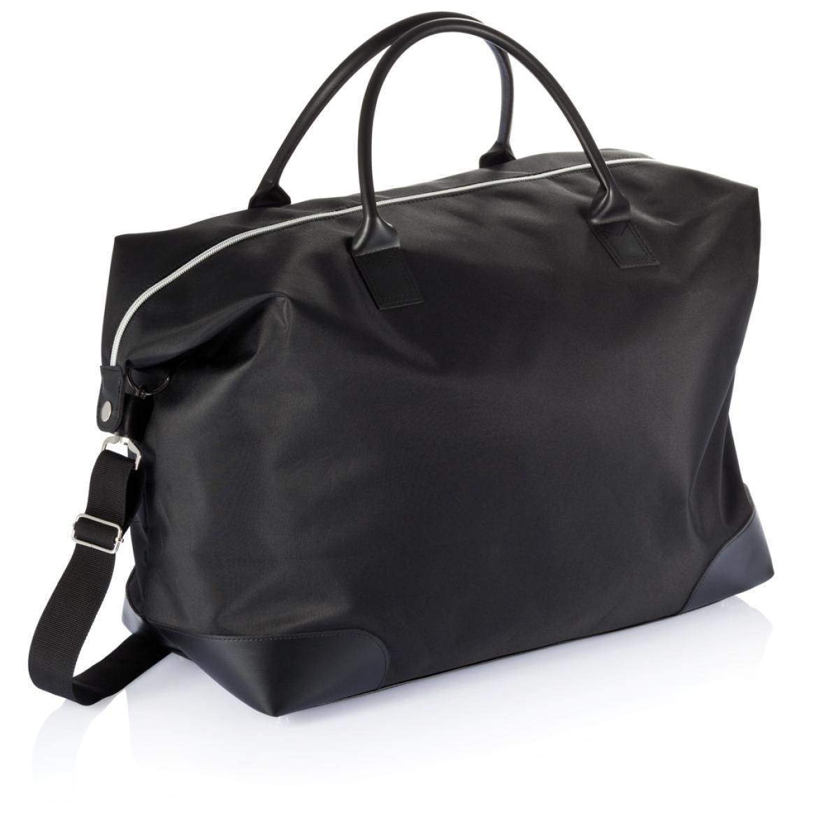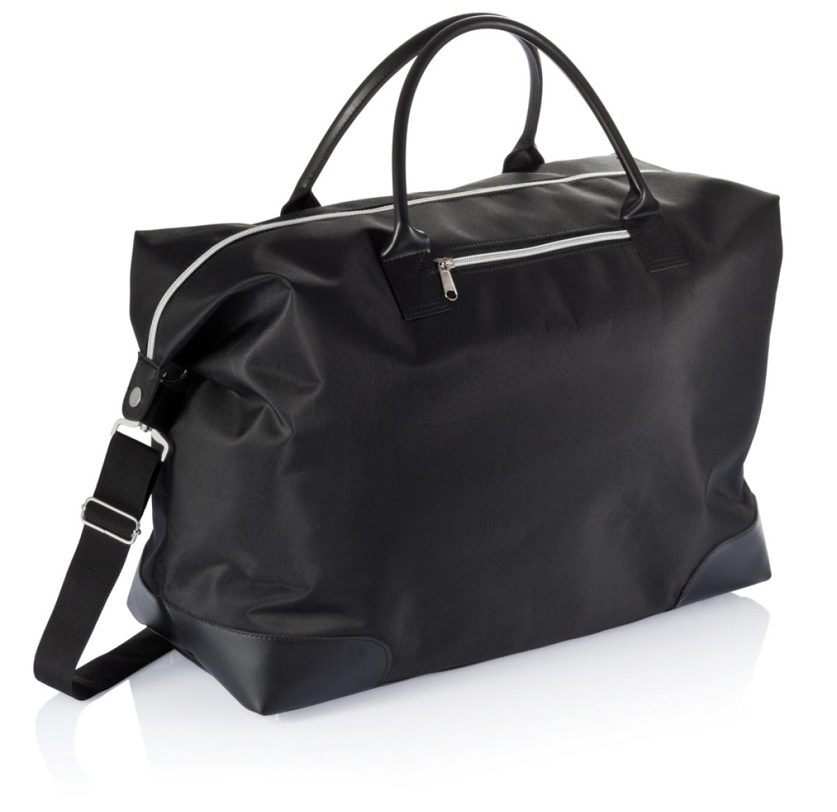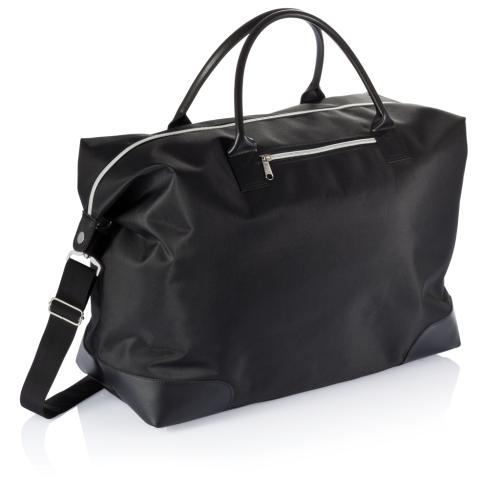 Microfibre weekend bag with zipper, one compartment with front pocket and zipper, handles and separate shoulder strap.