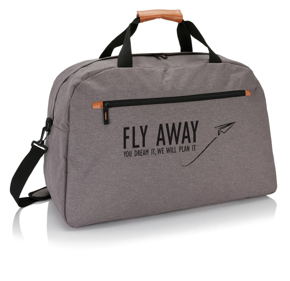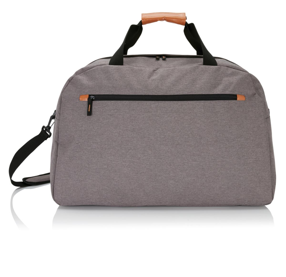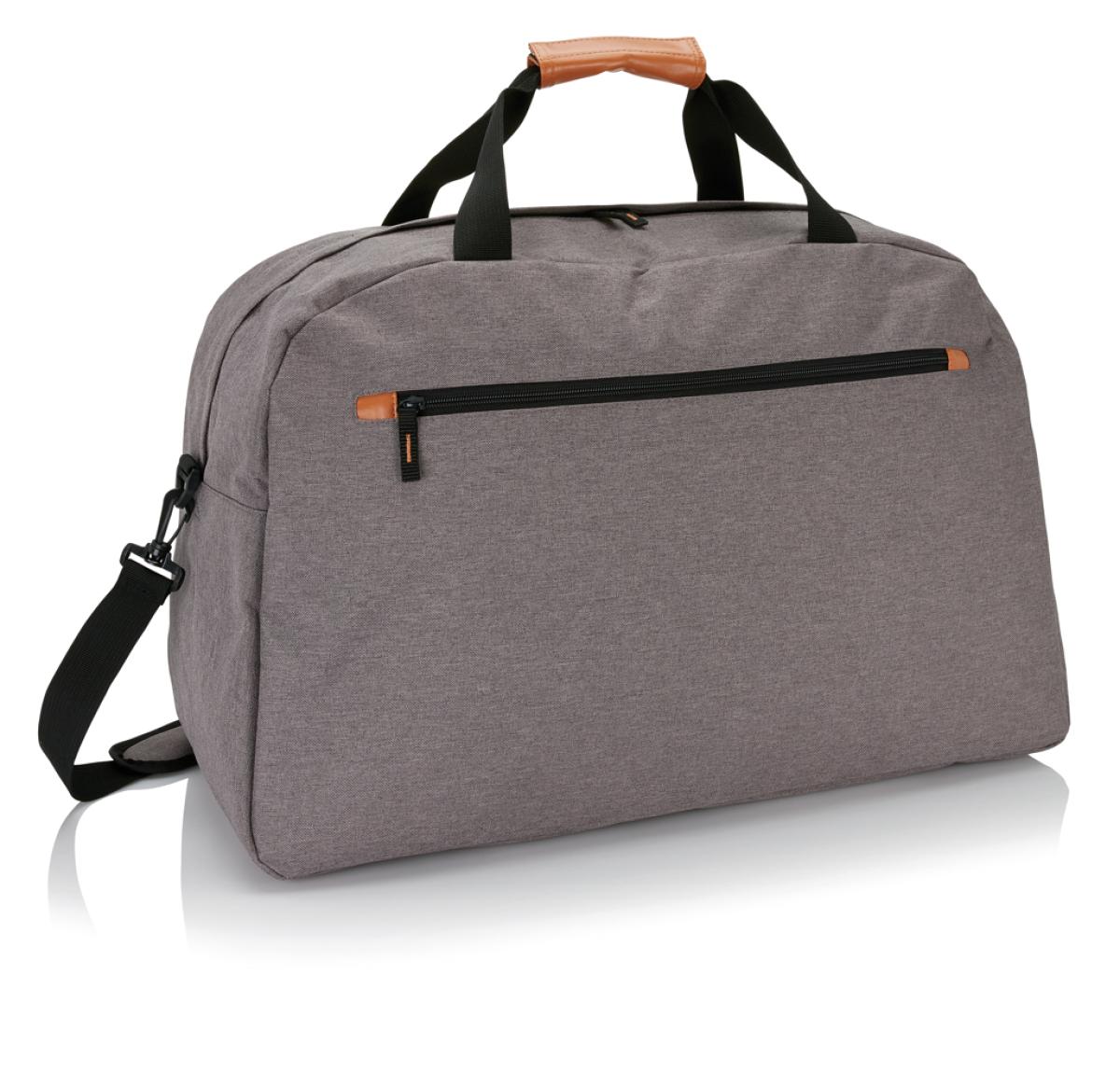 600D 2 tone polyester travel bag with fashionable brown details on the handles and zippers.