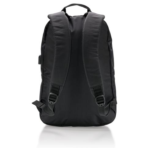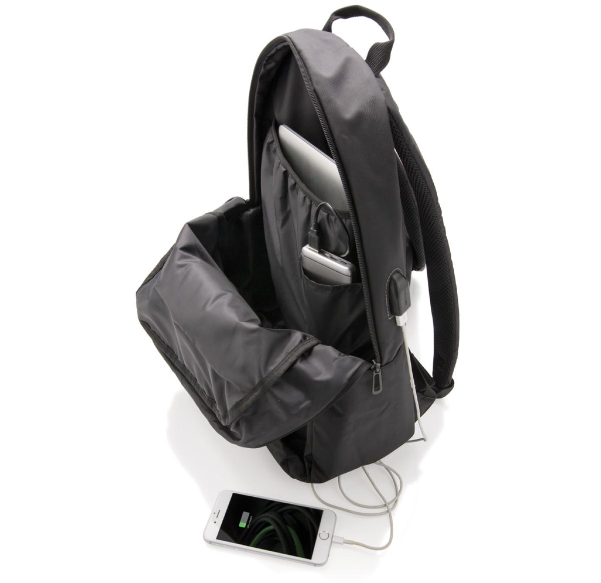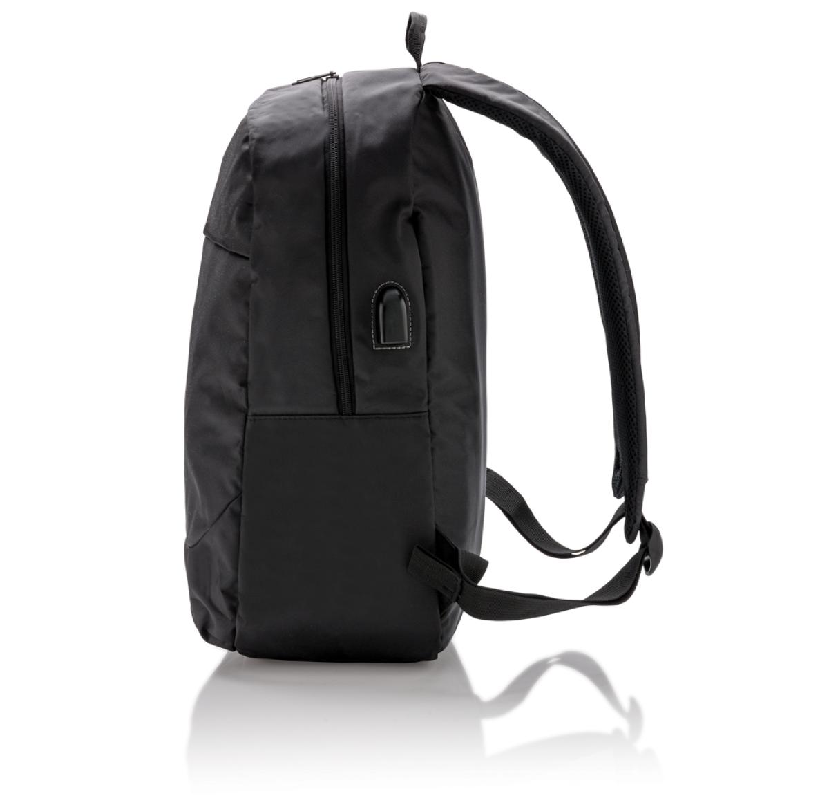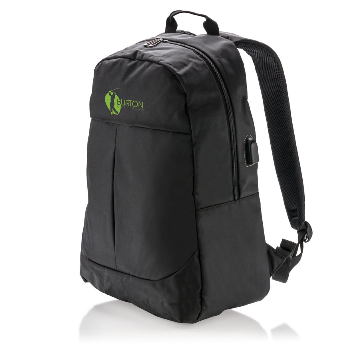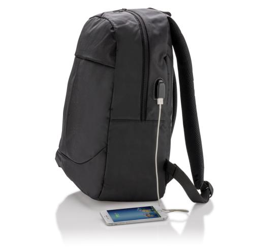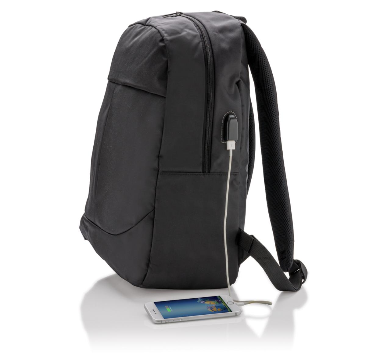 Stay connected while you’re on the go with this functional 600D polyester 15” laptop backpack with USB output. Just connect any powerbank into the usb input and charge your gear on the side USB output!