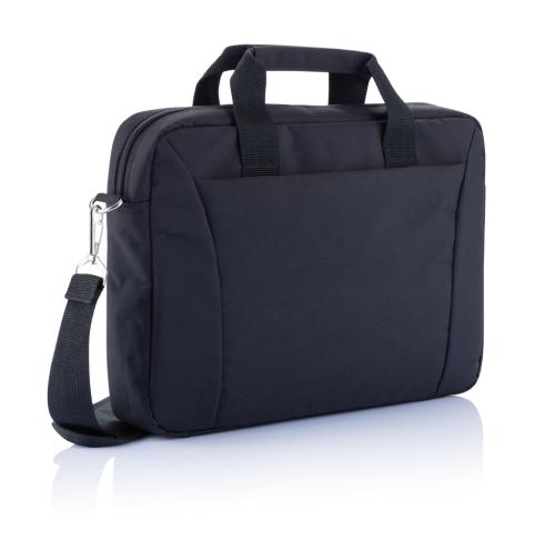 300D polyester laptop bag which is ideal for lightweight travelling. It has all the pockets you need, 15.4” laptop compartment, space to put your papers and a trolley sliding system. PVC free.