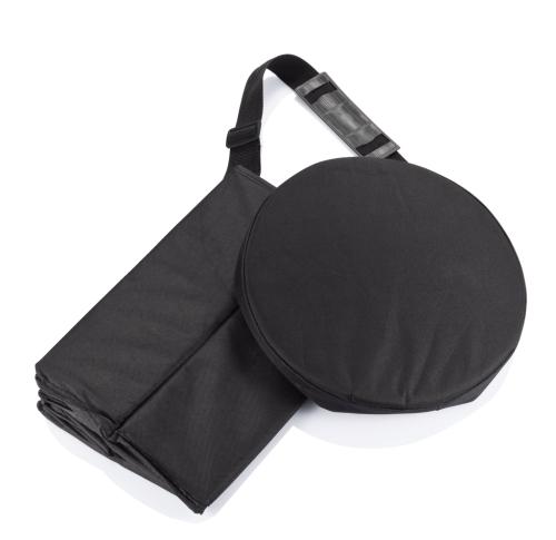 600D polyester in black with PE coating, 30cm diameter, foldable. Usable as cooler and seat.