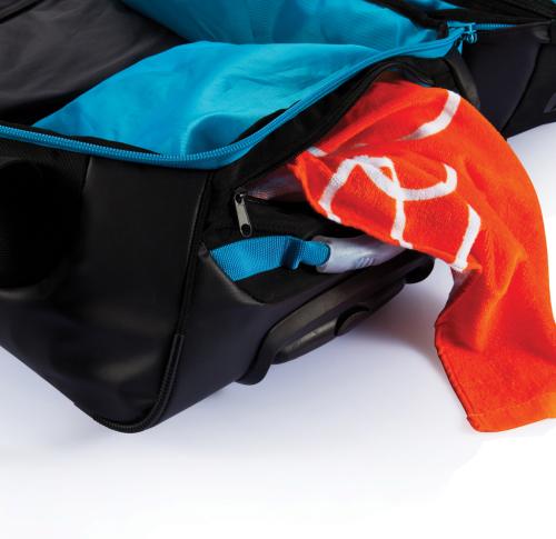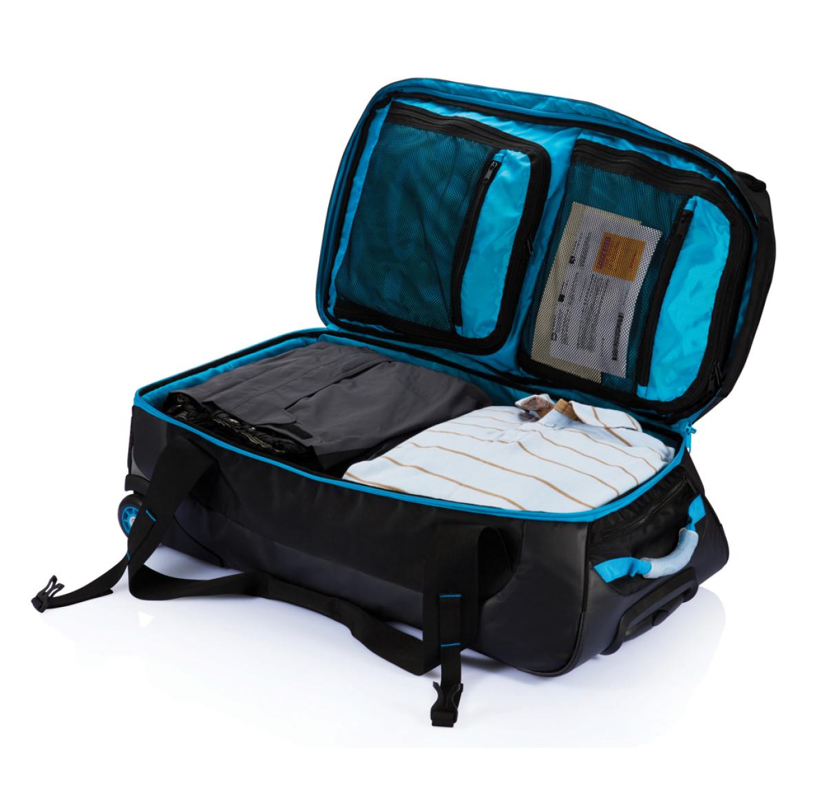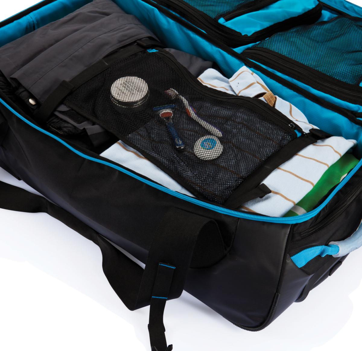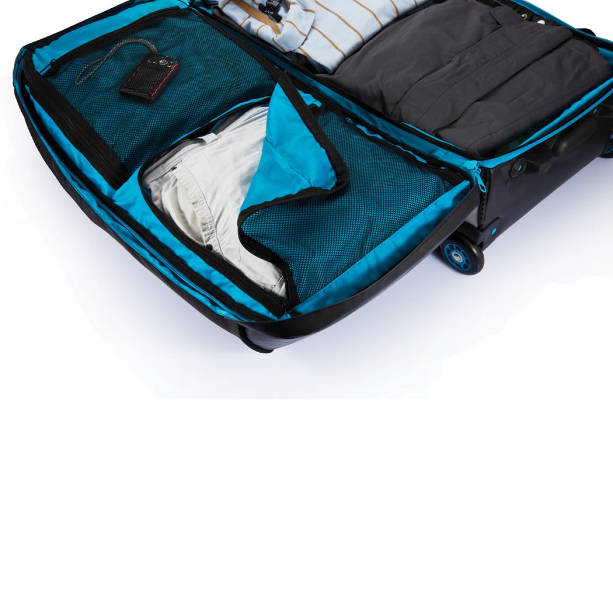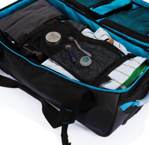 600D and 210D ripstop, large main compartment with zipper closure. Plenty of inside zipper pockets, including one detachable mesh zipper pocket. Aluminium trolley handle in matching colour. Including name card holder. The ultimate travel bag.