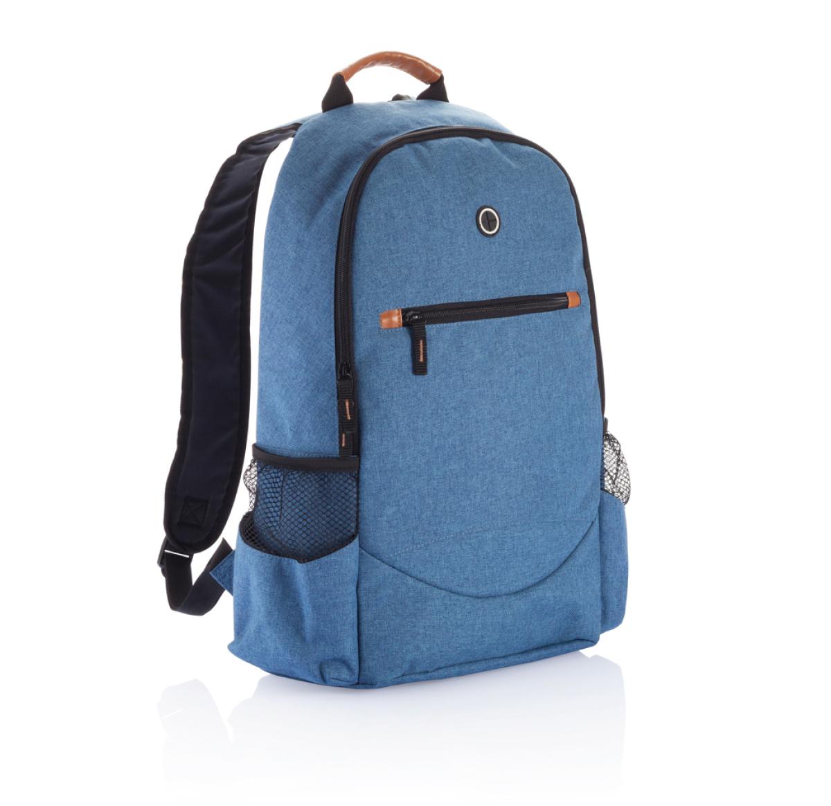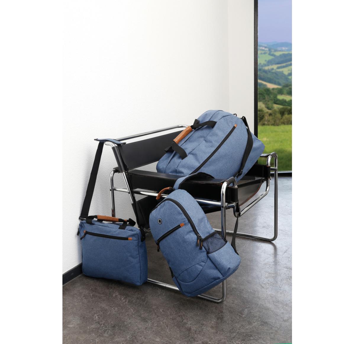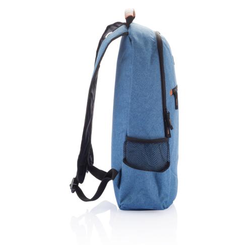 600D 2 tone polyester backpack with fashionable brown details on the handles and zippers.