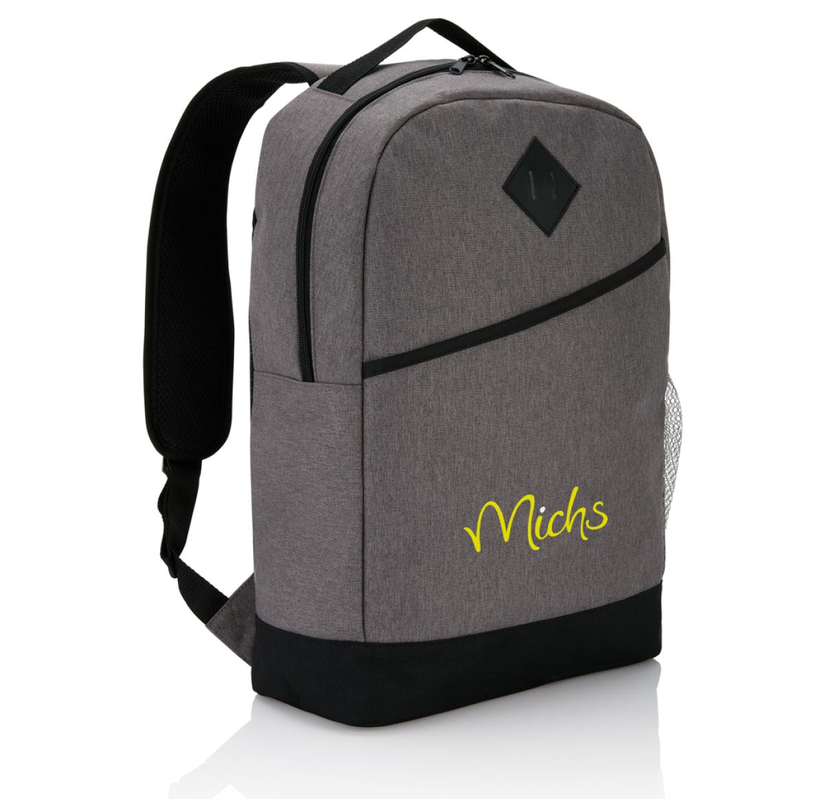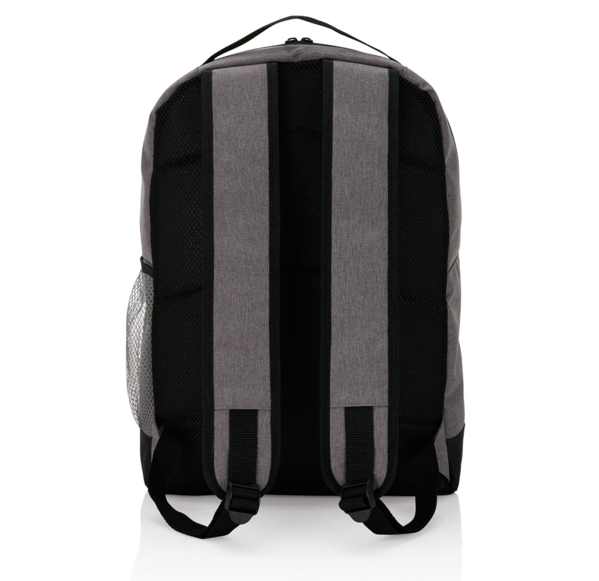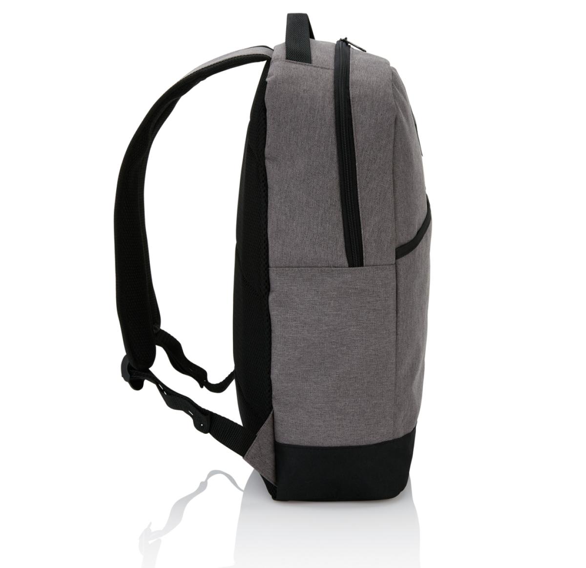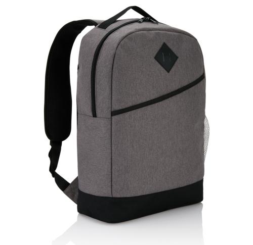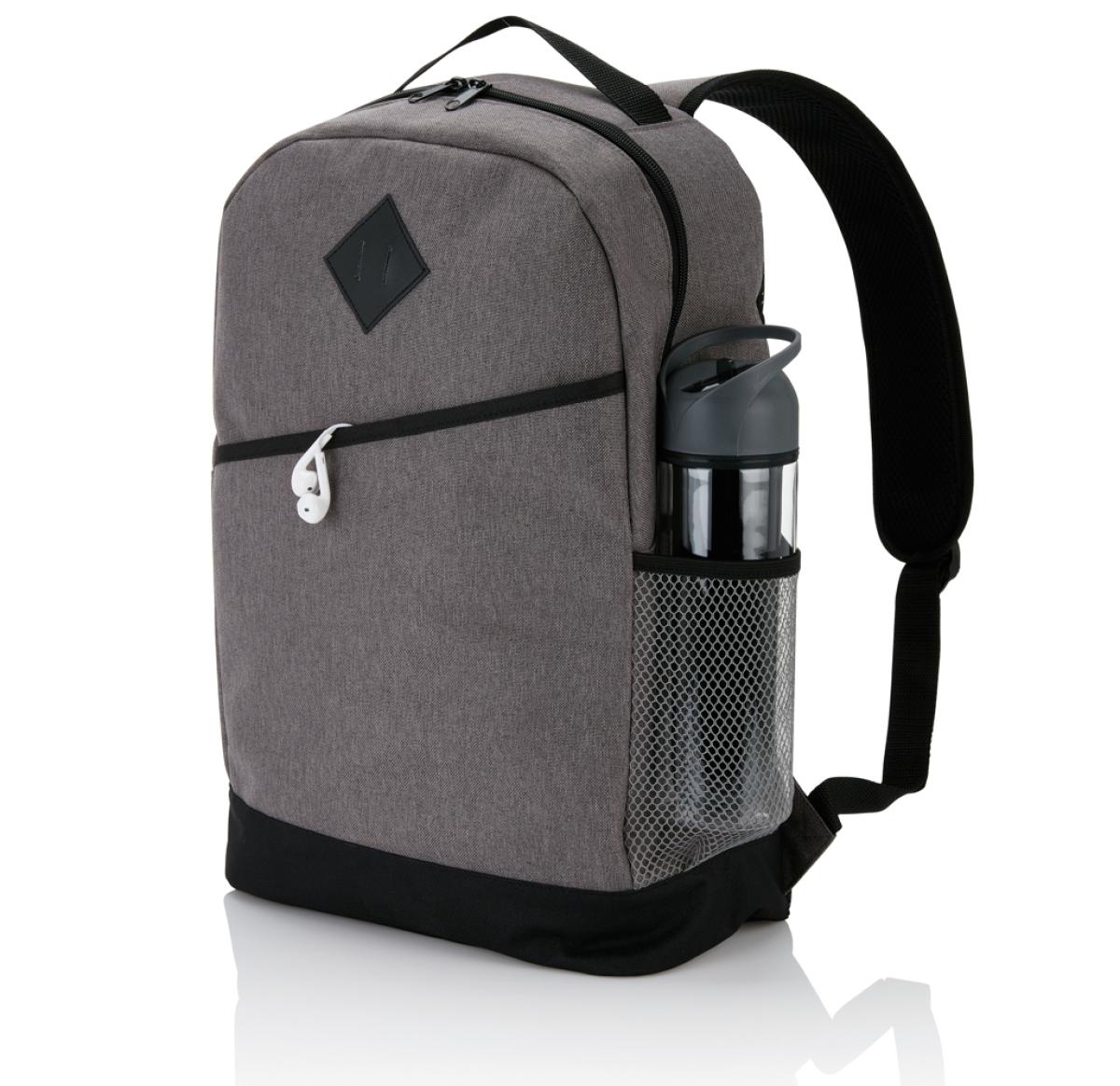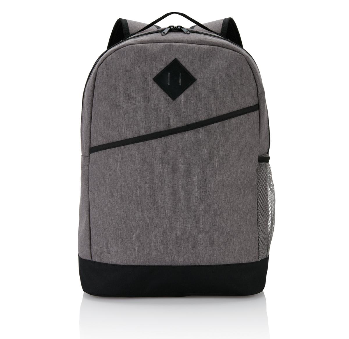 Modern 600D 2 tone polyester backpack with a zippered main compartment, a velcro front compartment, a side mesh pocket and adjustable padded shoulder straps. Air mesh padded back panel. PVC free.