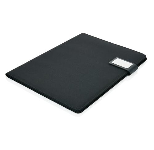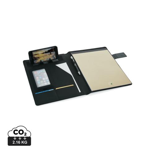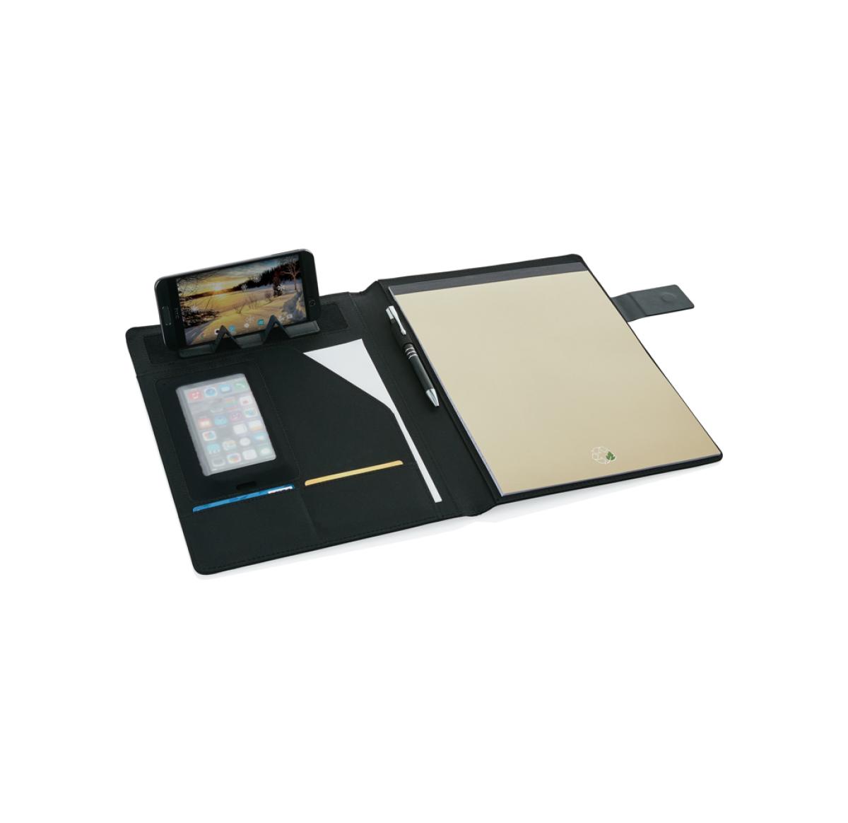 A4 tech portfolio with luxury magnetic metal closure. Inside: a tablet/phone stand, phone holder with see-through window which allows you to view and access your device. Suitable for most common phones. With sleeve for documents, 2 card holders and pen lo