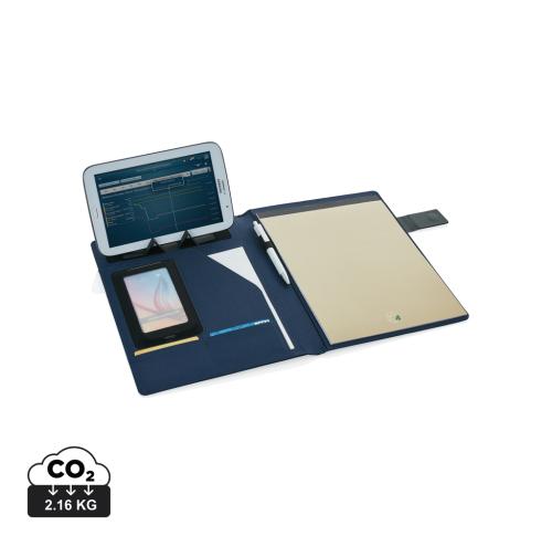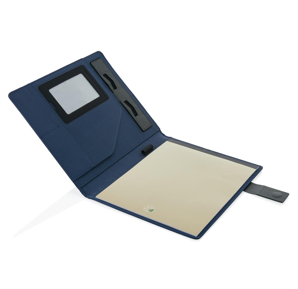 A4 tech portfolio with luxury magnetic metal closure. Inside: a tablet/phone stand, phone holder with see-through window which allows you to view and access your device. Suitable for most common phones. With sleeve for documents, 2 card holders and pen lo
