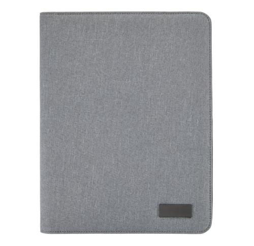 A4 linen zippered tech portfolio. Inside: a phone/tablet stand, phone holder with see-through window which allows you to view and access your mobile device. Gadget holders for example USB stick, charging cable & powerbank. 5 card holders and one ID holder