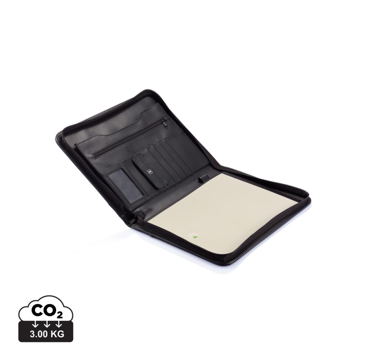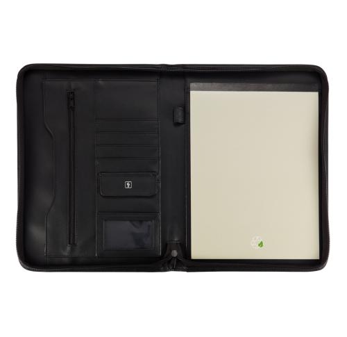 Zipper portfolio with zipper closure, zippered pocket and slide in pocket inside, 4 name card holders, USB pocket and pen holder, including A4 writing pad with beige cover, 20 sheets recycled paper with recycle logo.
