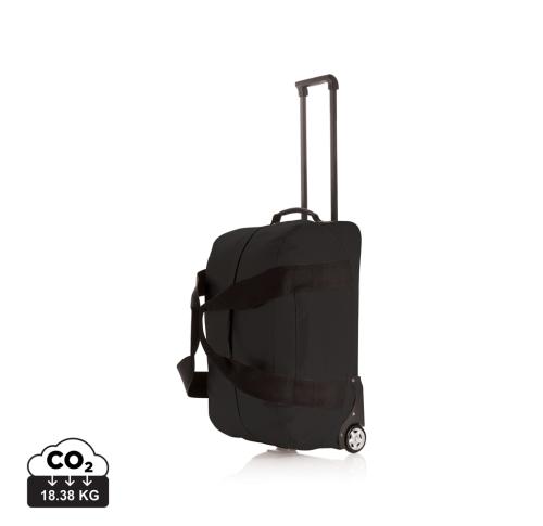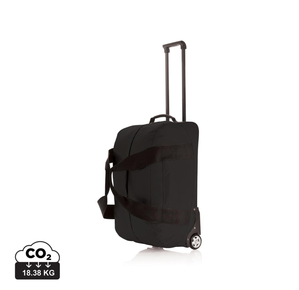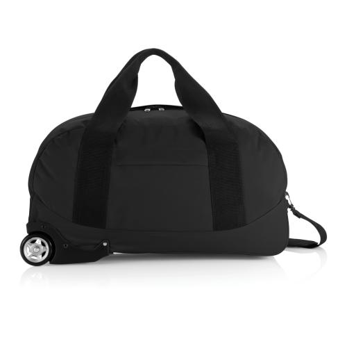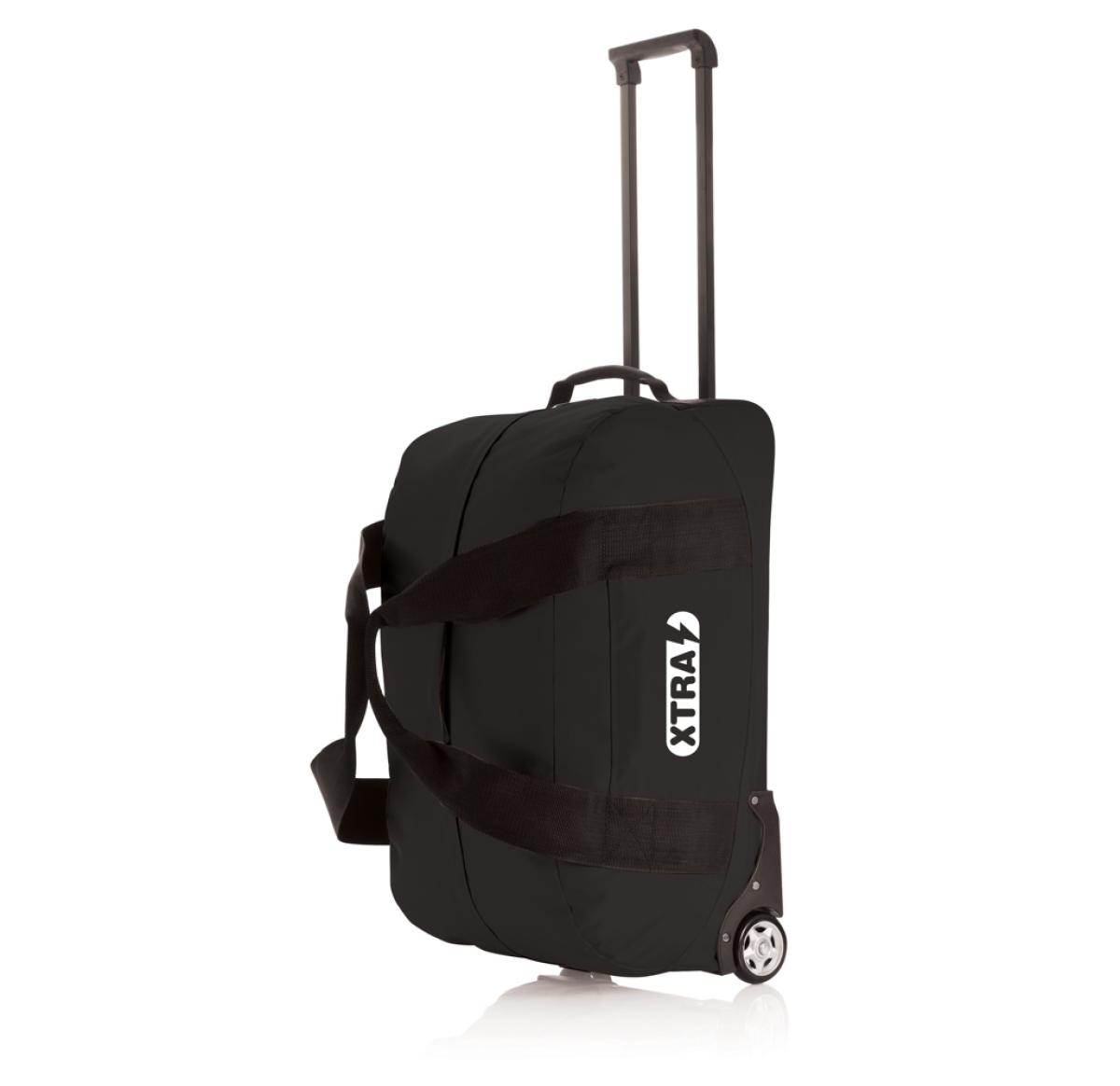 300D high density extra strong fabric. With extendable trolley system, silver coloured wheels and adjustable shoulder strap. One front pocket and one zipper closure main compartment.