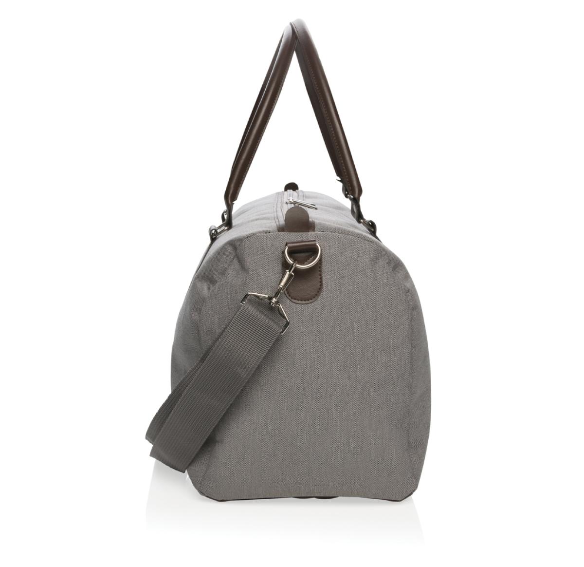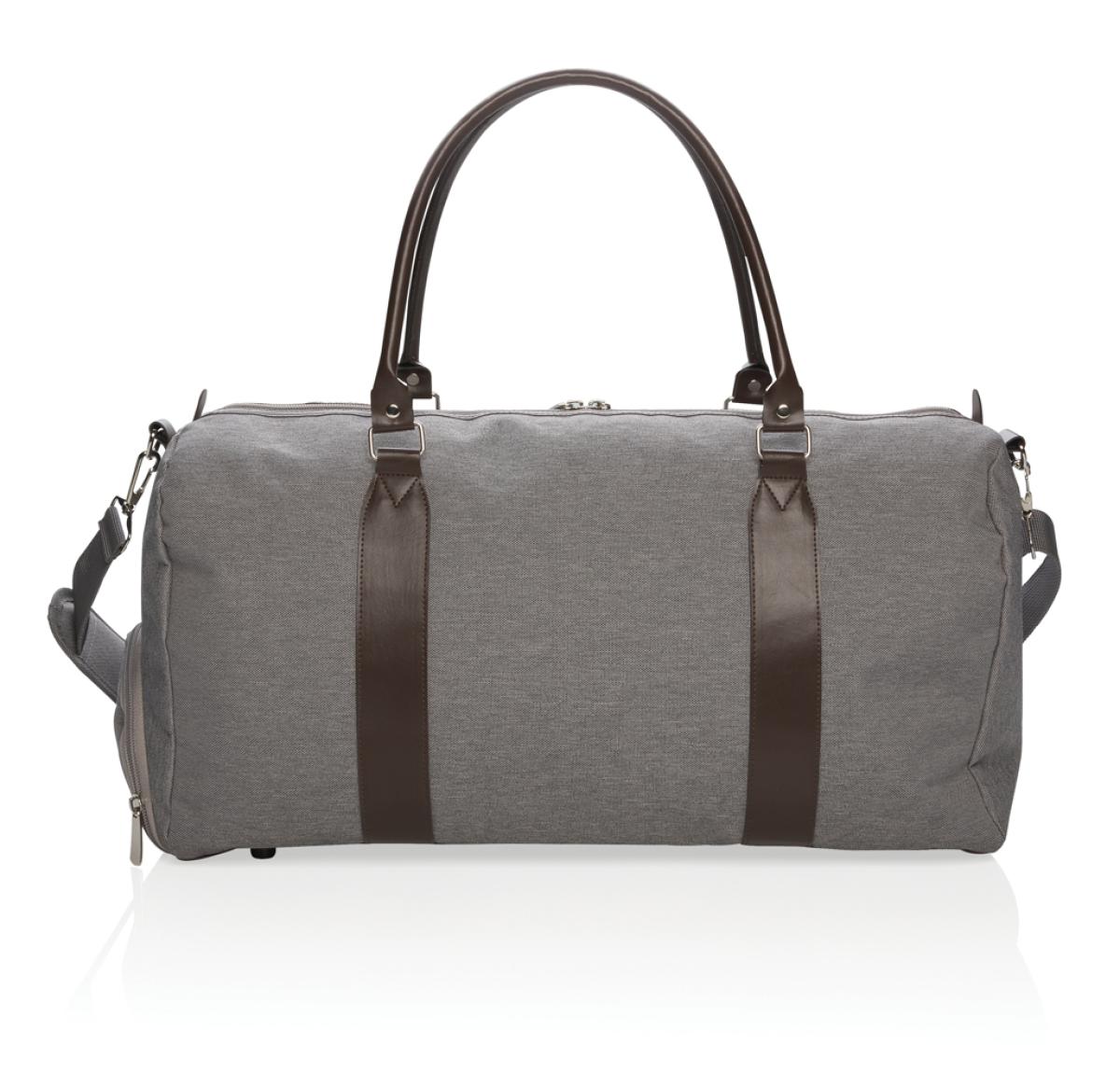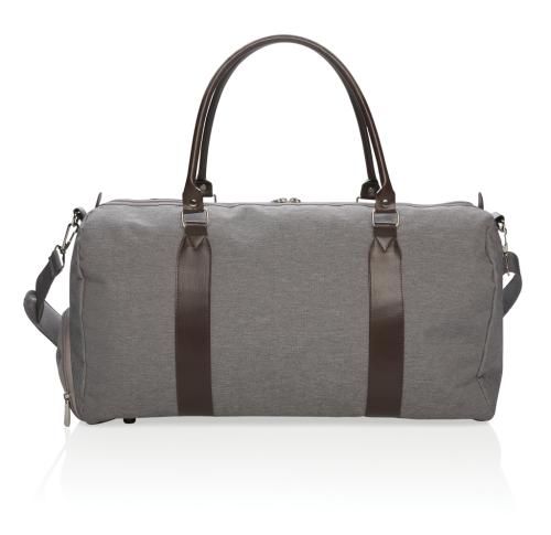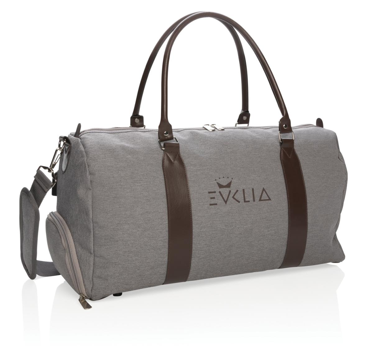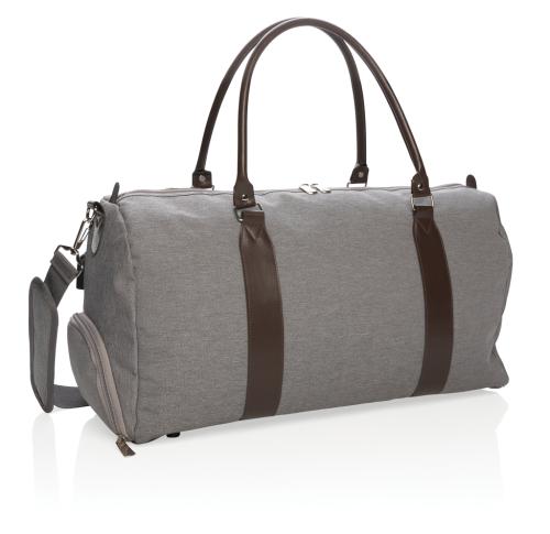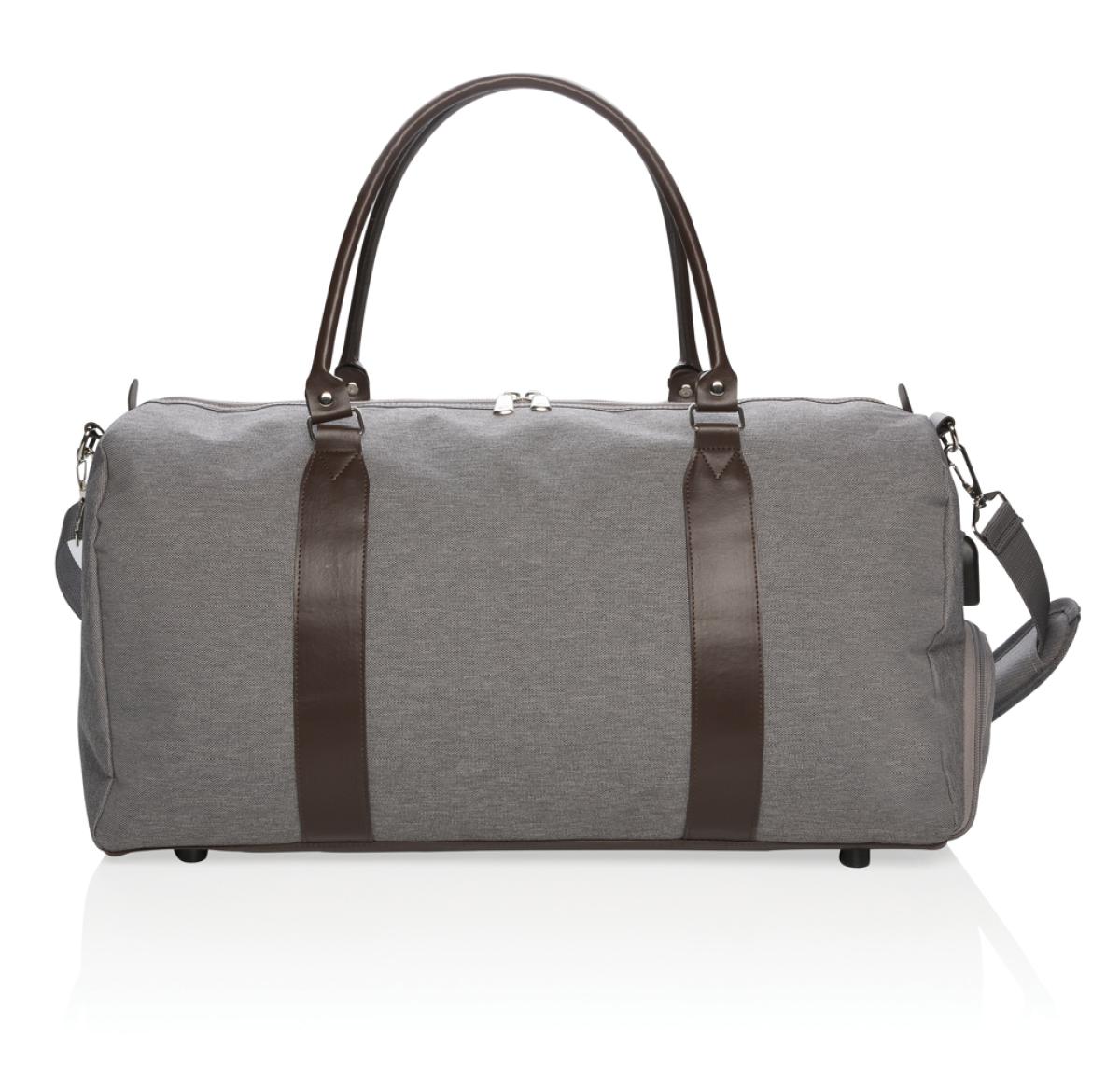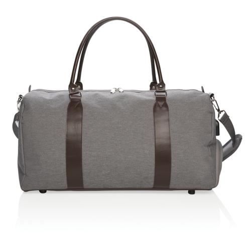 Modern and minimalist 600D polyester weekend bag with PU handles & comfortable shoulder strap. Large main compartment with plenty of room for your weekend necessities or sports gear. Connect your powerbank easily to the integrated USB charging port and ch