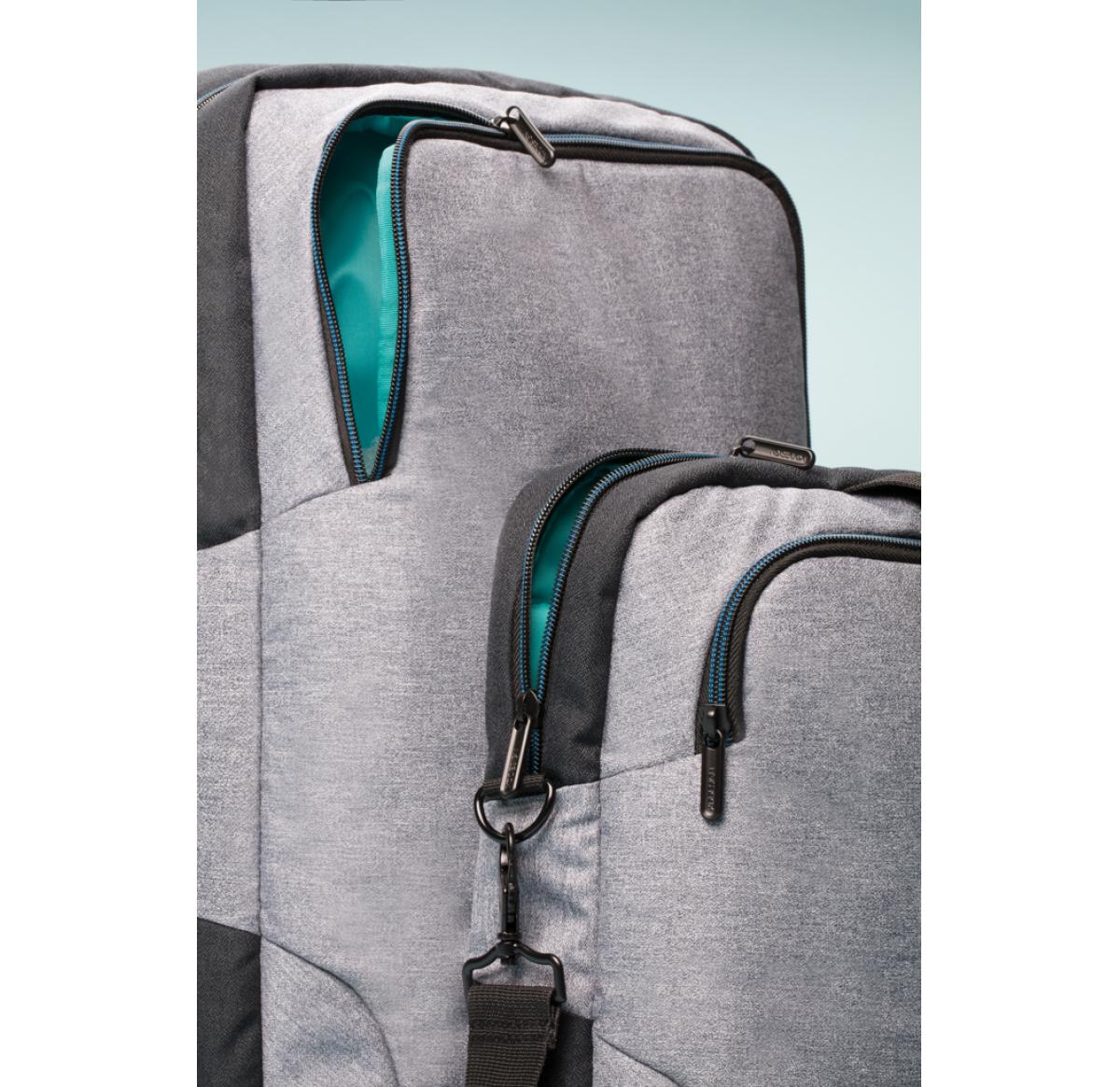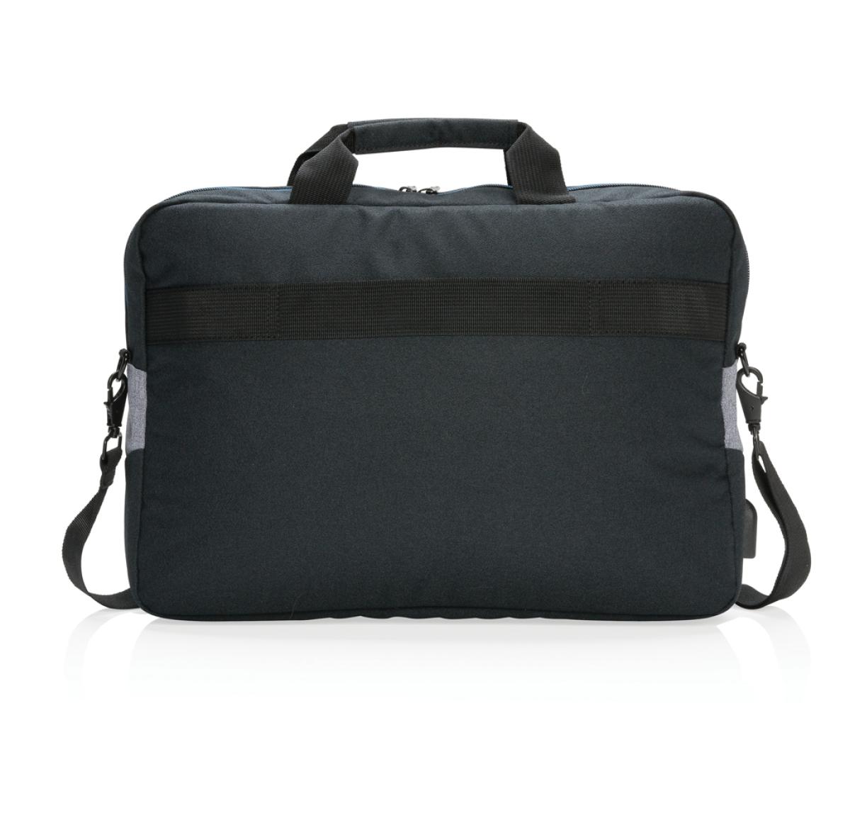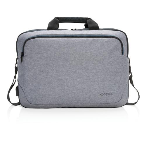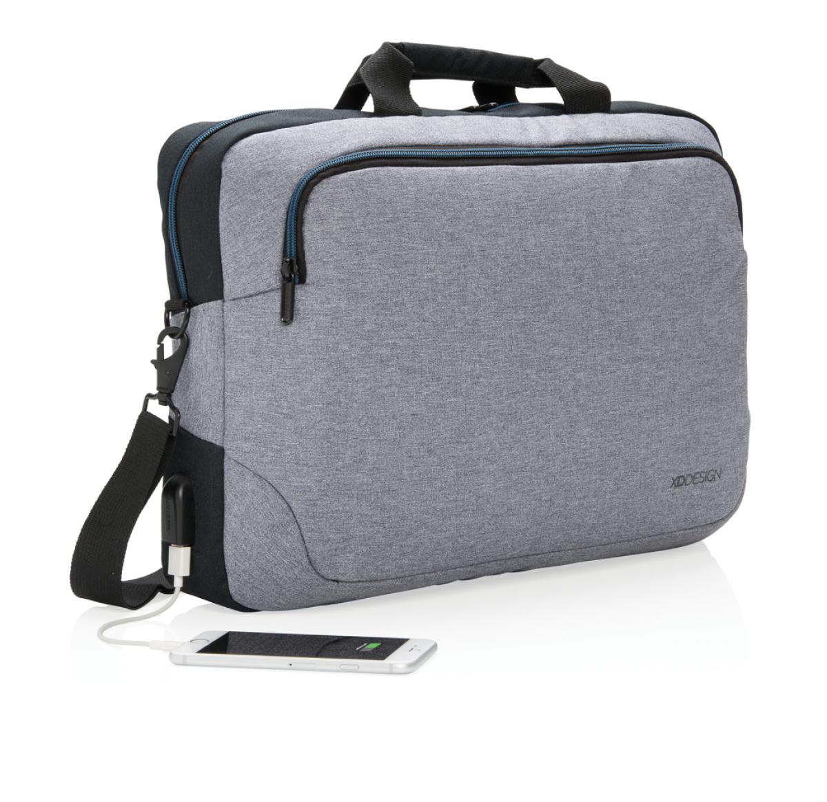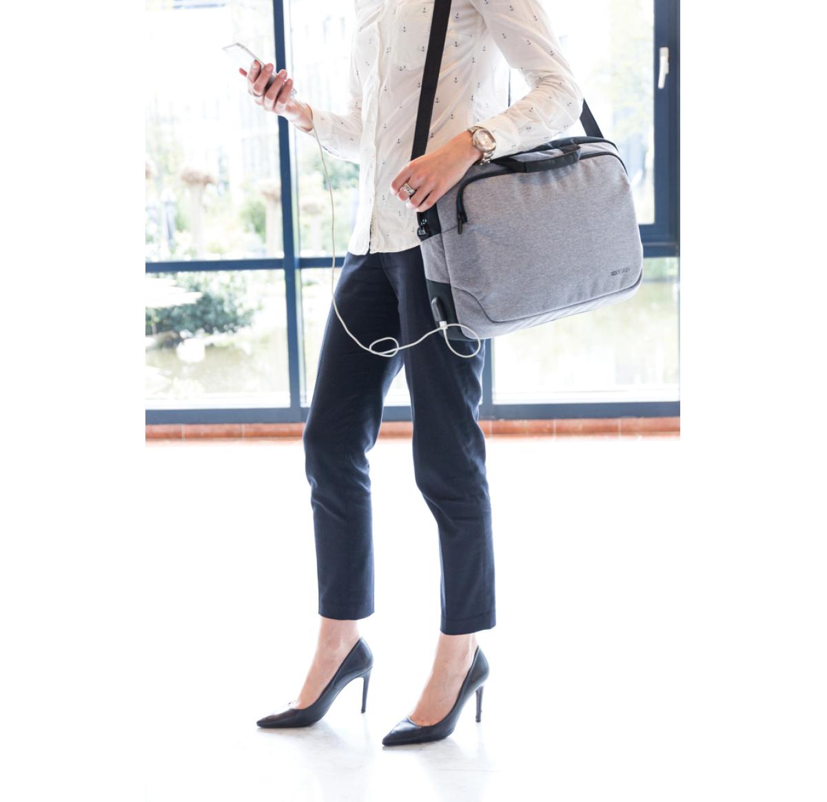 Unique designed 15” laptop bag with one large main compartment for your laptop and one front compartment. Connect your powerbank easily to the integrated USB charging port and charge your phone or tablet on the go. Registered design®