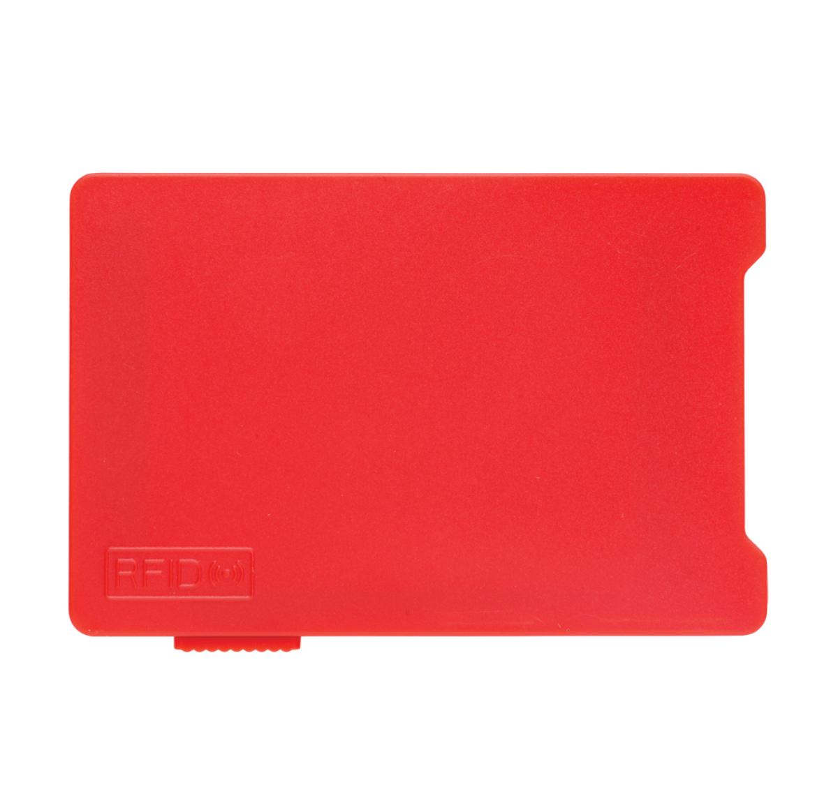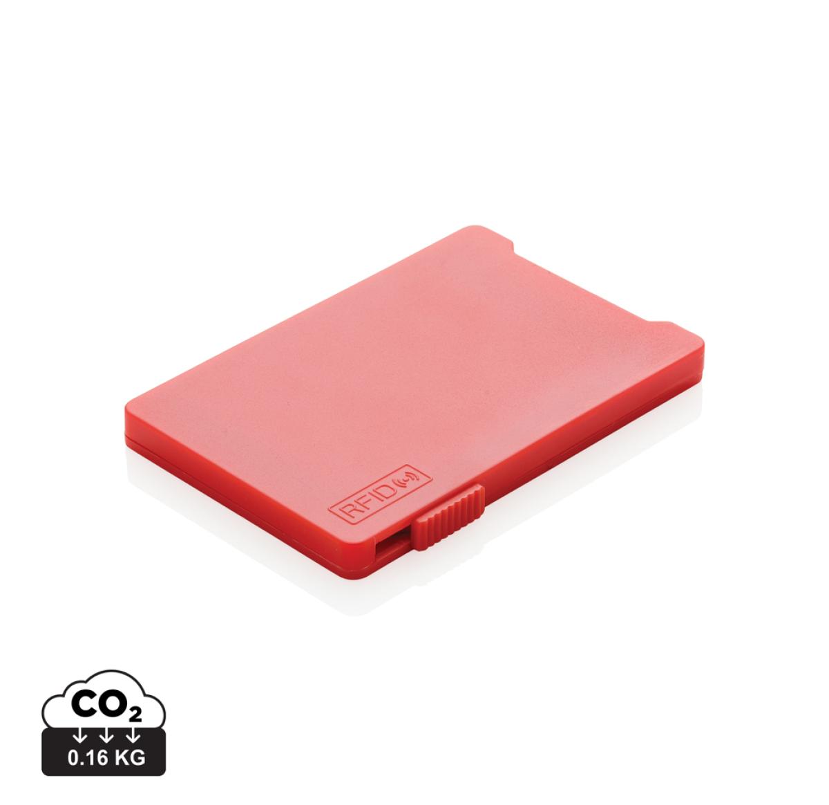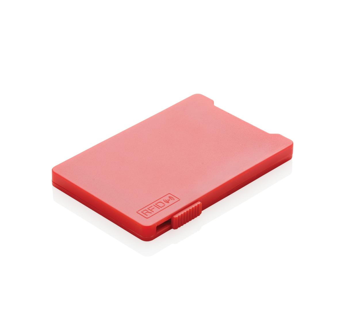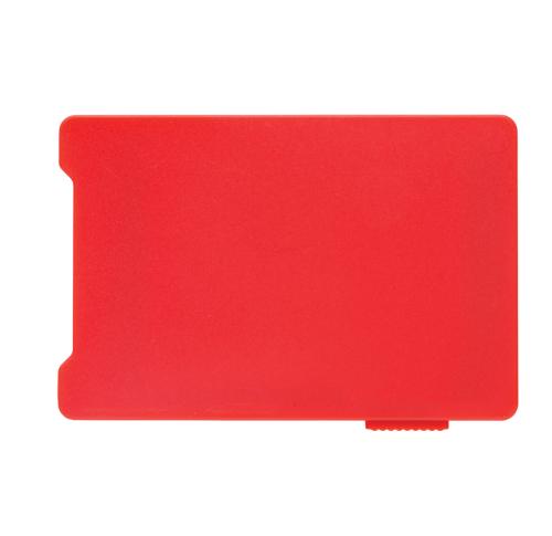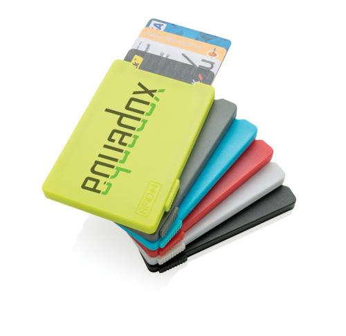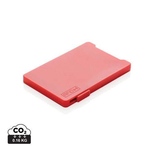 This card holder can hold a maximum of 4 cards or 3 embossed cards. Its designed to block RFID readers from electronic pickpocketing. The slider on the side will push the cards up. Registered design®