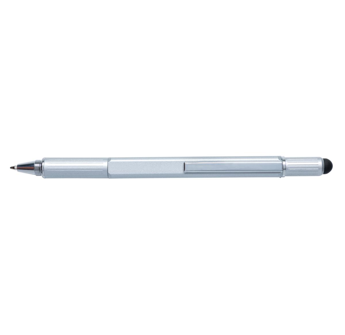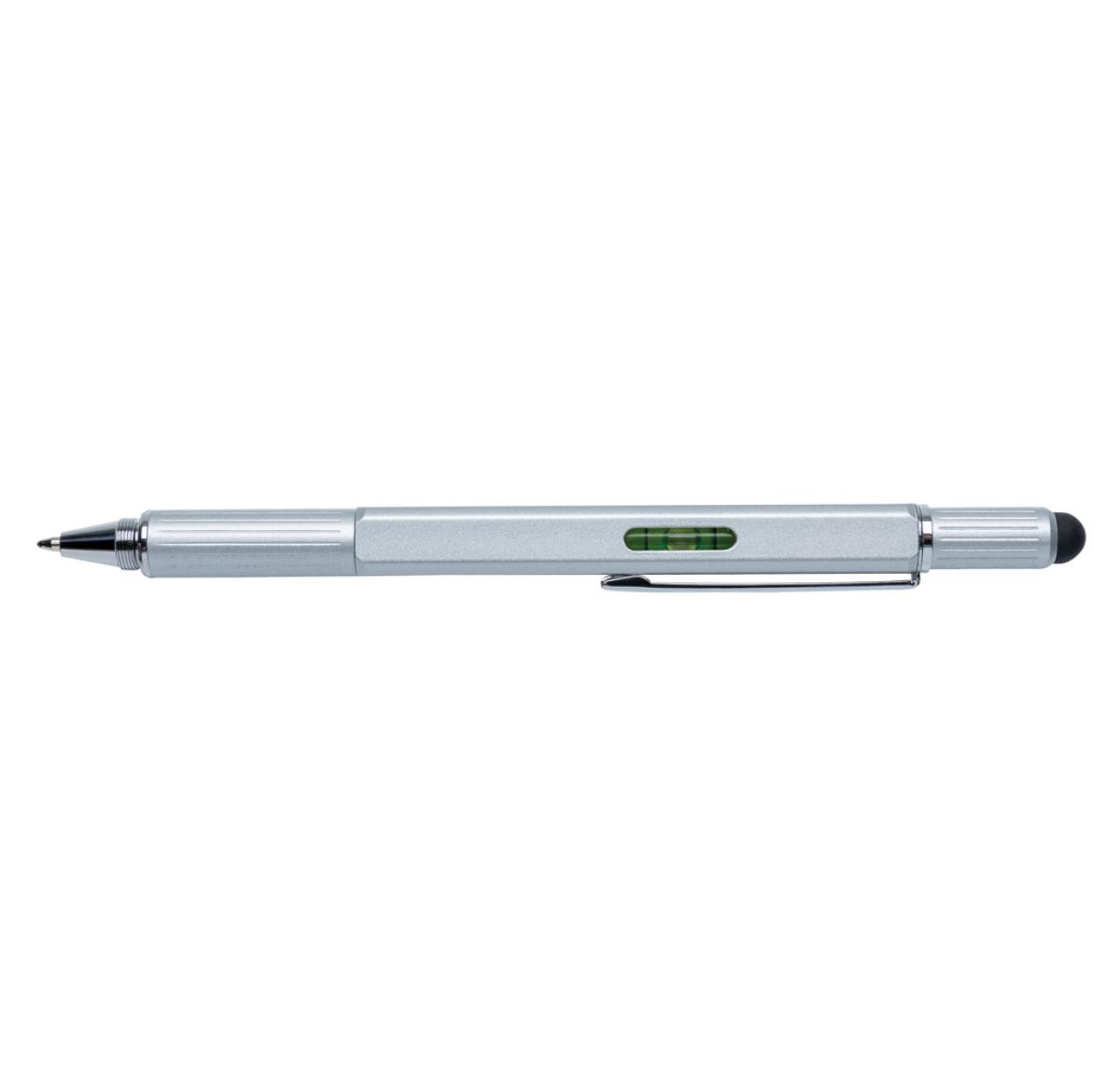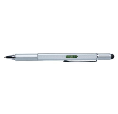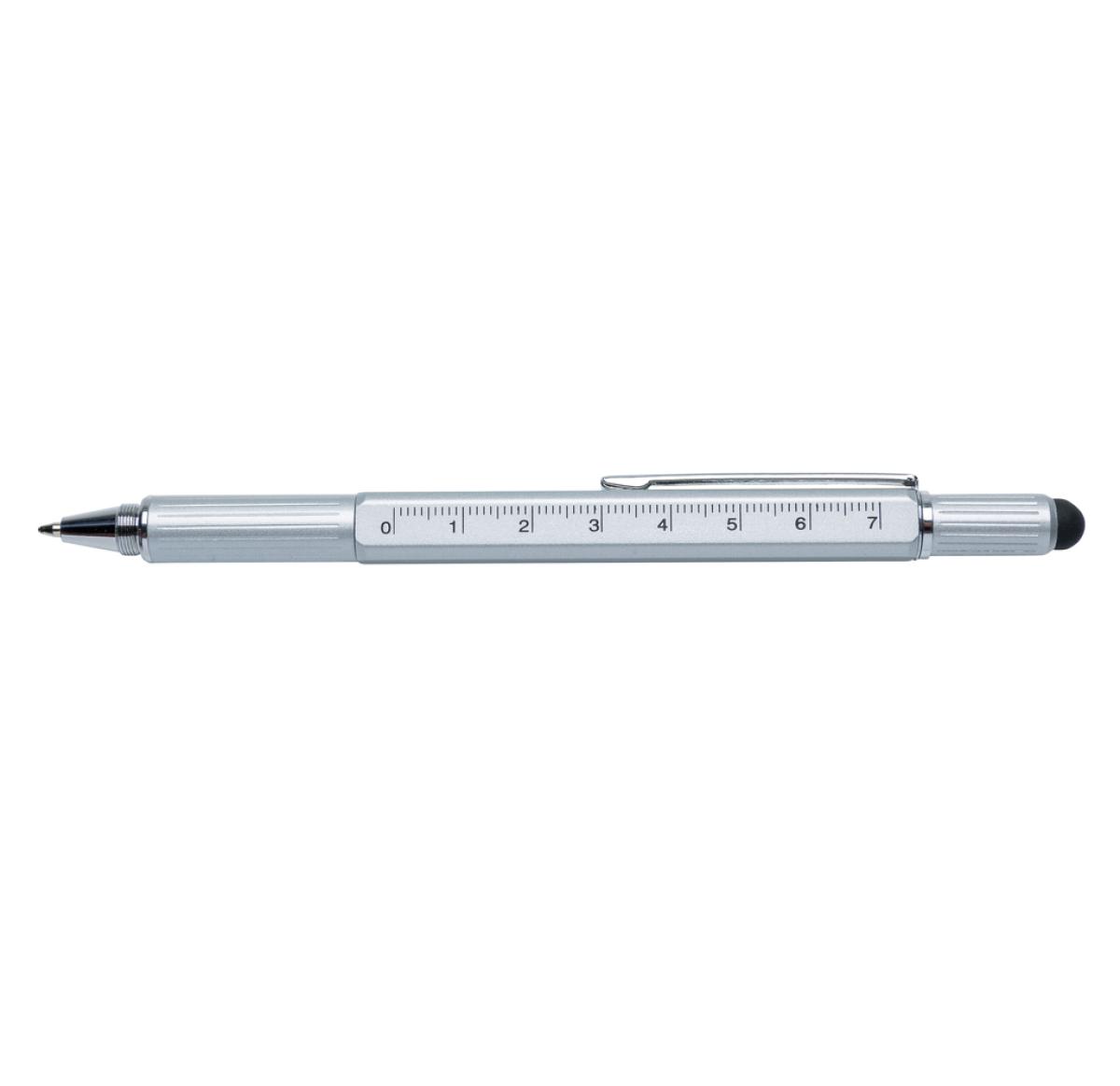 Multifunction pen with ruler (7cm) , spirit level, screw driver, stylus tip and ballpoint with blue writing ink (up to 400m) Made out of high quality brass material with aluminium clip.