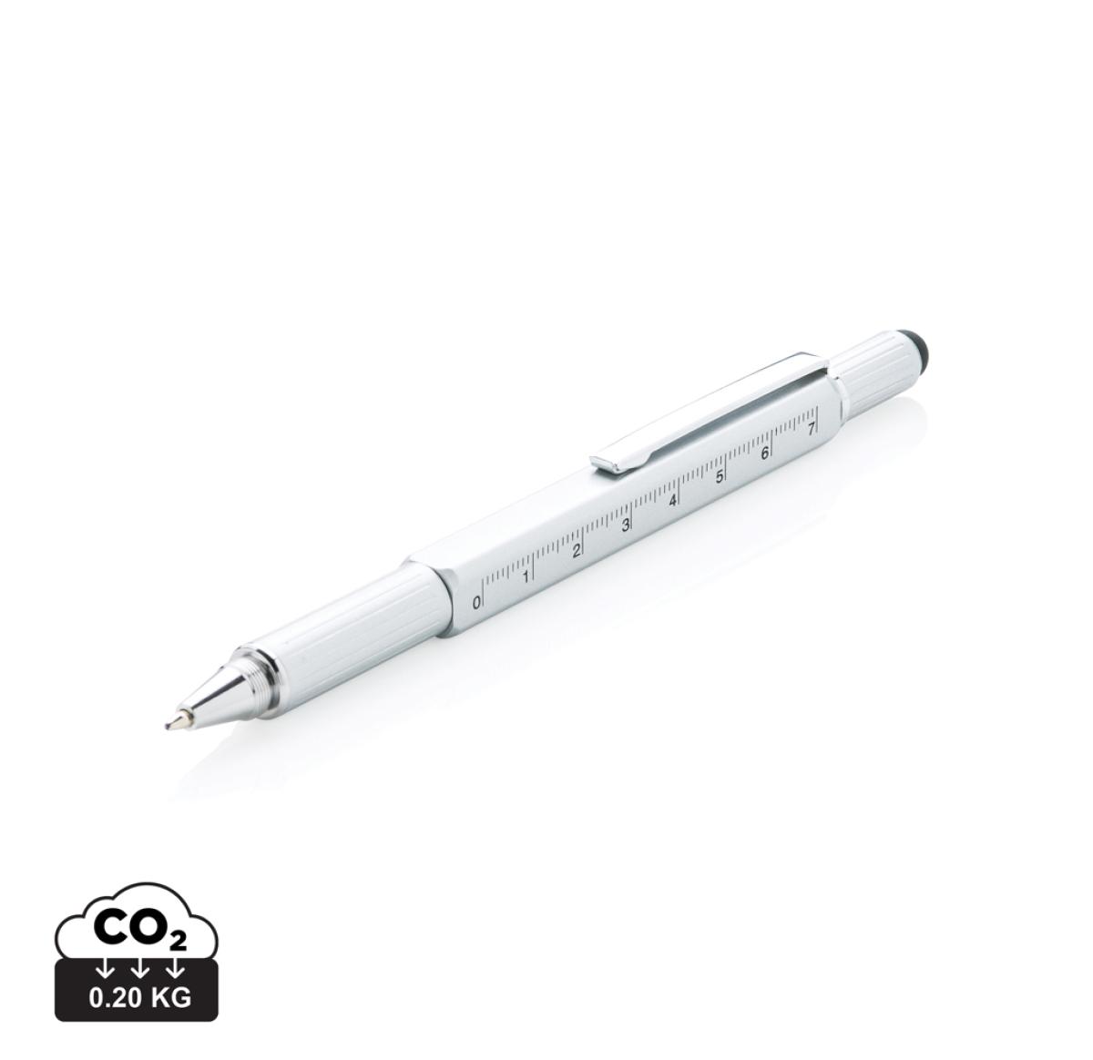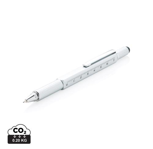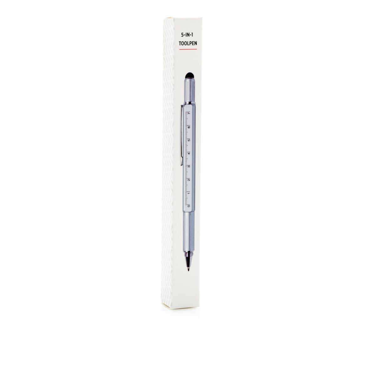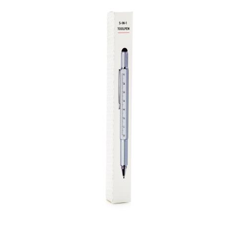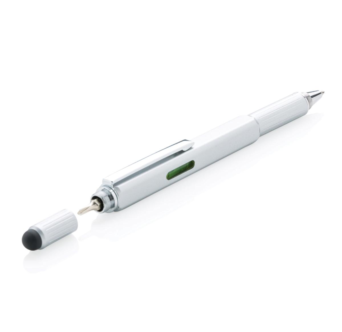 Multifunction pen with ruler (7cm) , spirit level, screw driver, stylus tip and ballpoint with blue writing ink (up to 400m) Made out of high quality brass material with aluminium clip.