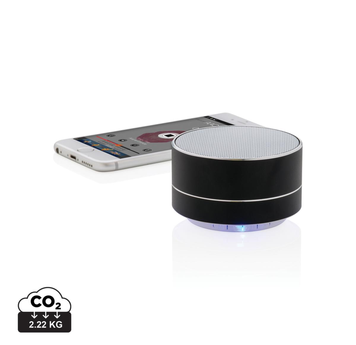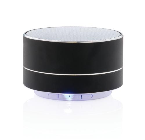 Aluminium 3W speaker with built-in 300 mAh lithium battery. With playing time up to 4 hours on one single charge and operating distance of 10m. Including ambient blue light on the bottom. With pick up function to answer incoming calls.