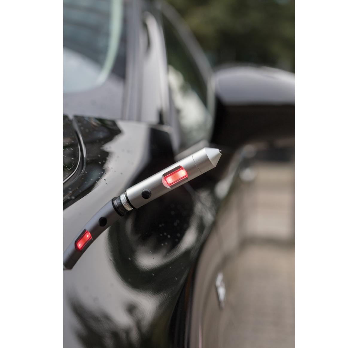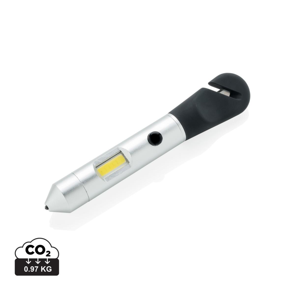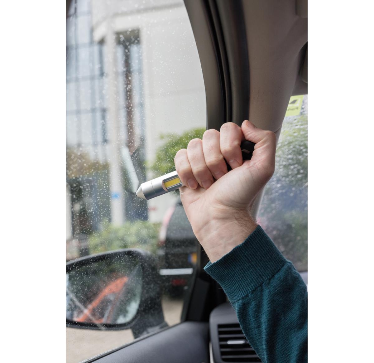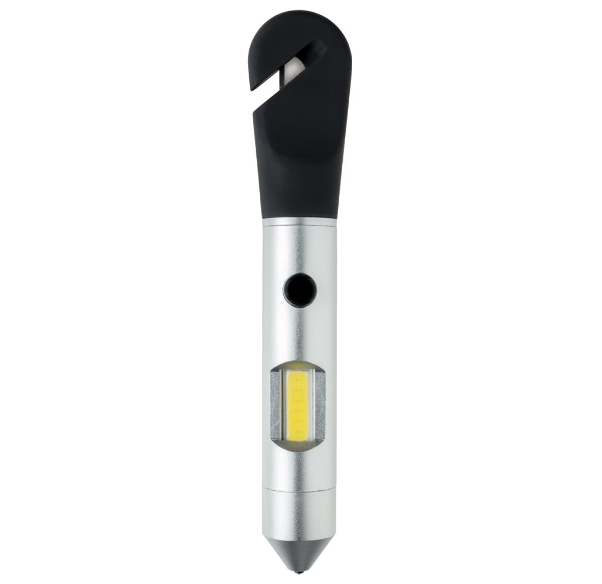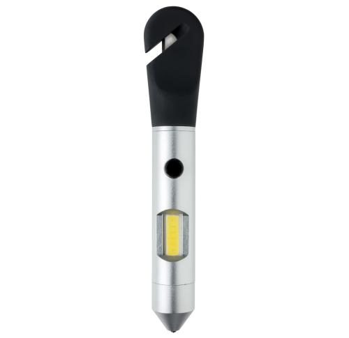 Multifunction tool that includes a COB light, safety hammer, belt cutter and magnet. The light can be switched into red emergency mode to attach to your car with the built-in magnet. The safety hammer and window breaker can be used to escape in case of an
